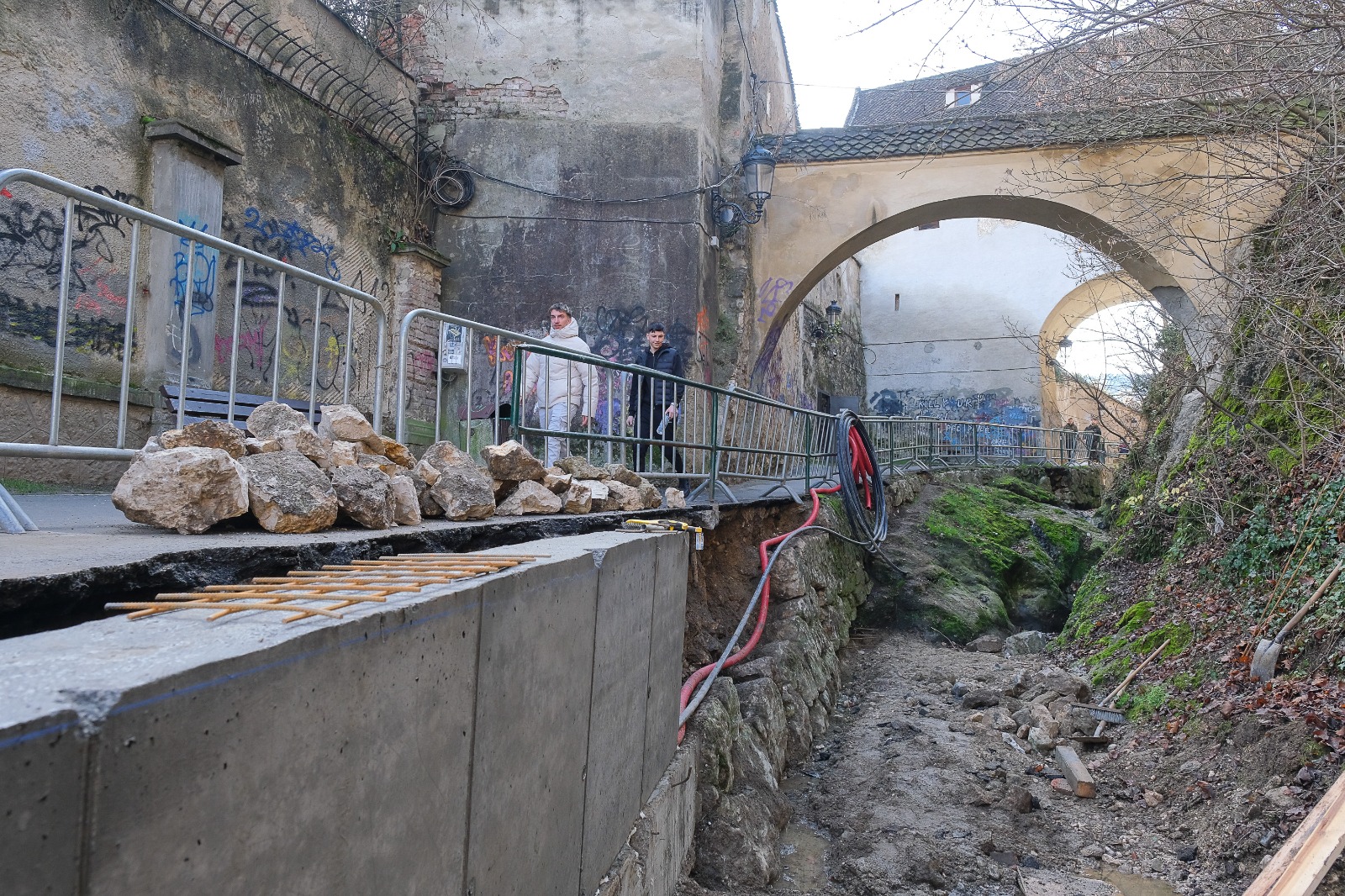 Lucrările la pârâul Graft, oprite după descoperirea unor probleme grave. Trotuar în pericol de prăbușire în zona Piața Brassai