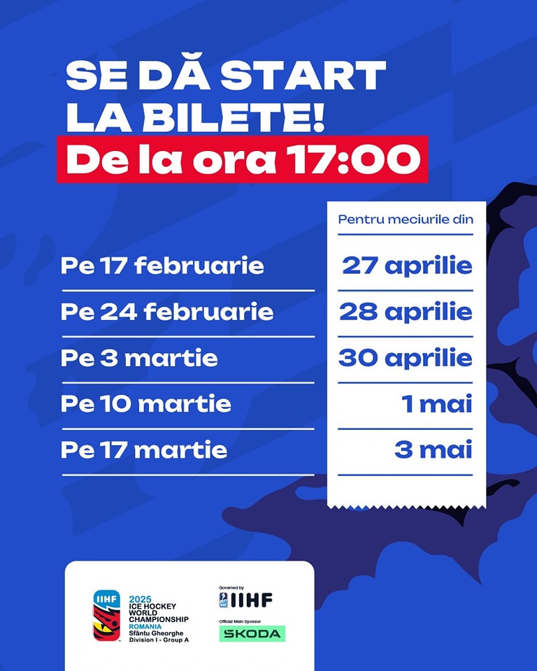 Vânzarea biletelor de meci pentru Campionatul Mondial de hochei pe gheață, Divizia I/A, de la Sfântu Gheorghe, va începe luni, 17 februarie, de la ora 17.00. Procesul se va desfășura în mai multe etape, asfel că biletele pentru cele cinci zile ale competiției vor fi puse în vânzare la aceeași oră, în fiecare zi de luni, în următoarele cinci săptămâni. Mai exact, se pot achiziționa bilete pentru meciurile din 27 aprilie pe 17 februarie, pentru 28 aprilie pe 24 februarie, pentru 30 aprilie pe 3 martie, pentru 1 mai pe 10 martie, respectiv pentru 3 mai pe 17 martie.