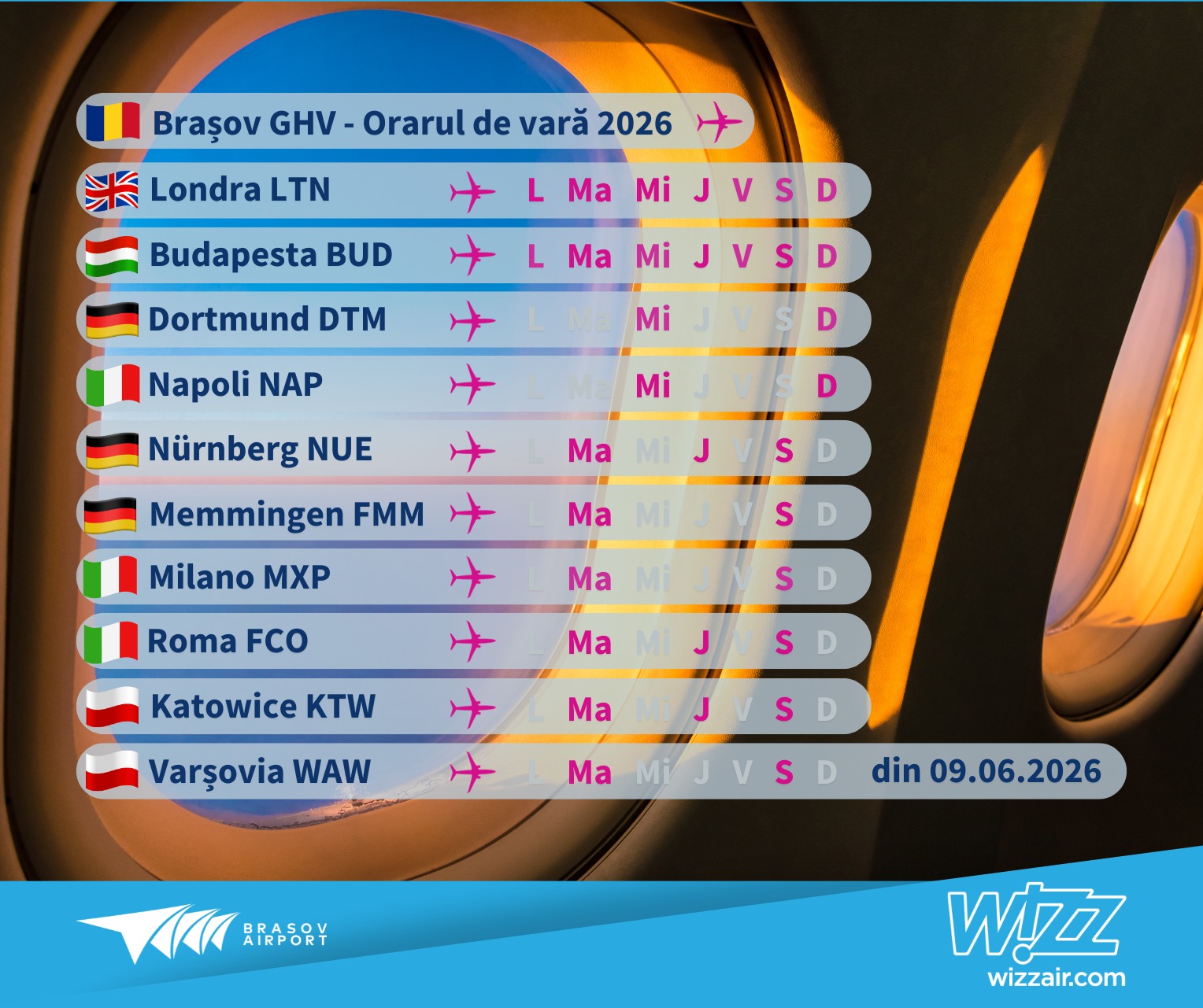 În total, vor fi disponibile 10 rute regulate din și către Aeroportul Internațional Brașov-Ghimbav, conectând România cu destinații importante din Marea Britanie, Germania, Italia, Polonia și Ungaria.