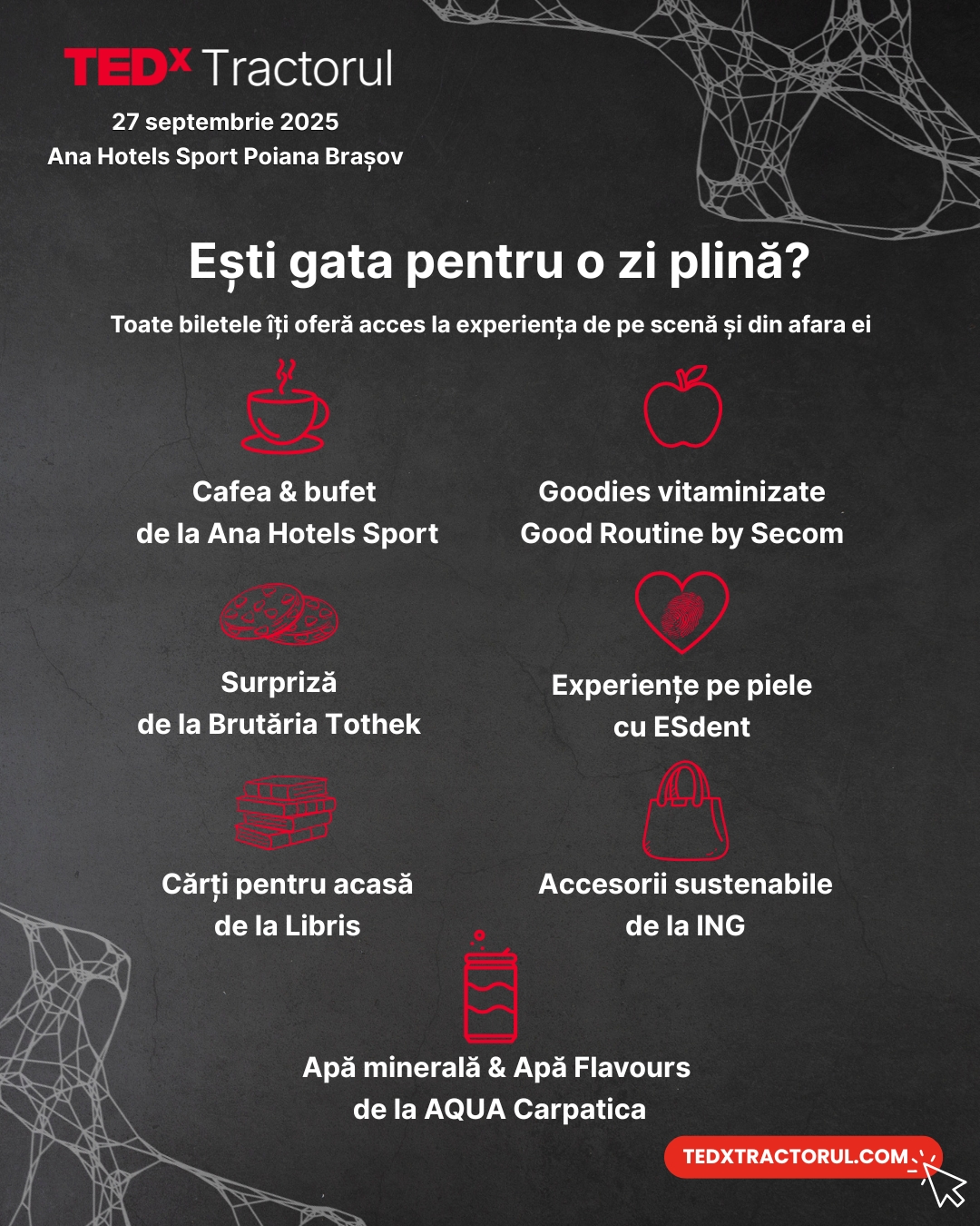 Mai mult decât o serie de discursuri inspiraționale, TEDxTractorul 2025 oferă o experiență completă. Cei care aleg biletul Experience vor avea acces și la afterparty, unde vor putea interacționa direct cu speakerii, într-un cadru relaxat, favorabil conexiunilor autentice și schimbului de idei.