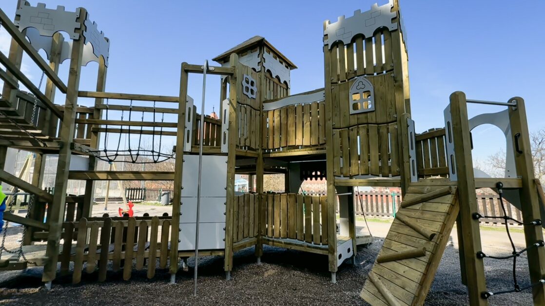 Elementul central este o instalație din lemn multistratificat în formă de castel, cu podețe drepte și înclinate, fixe și mobile, cu platforme cu înălțimi diferite, coborâre pe bara de pompieri, panou de cățărare, spaliere înclinate pentru cățărarea în mâini care oferă acces către cele patru turnuri, tobogane.