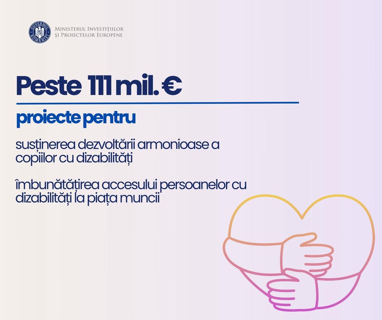 Ministerul Investițiilor și Proiectelor Europene (MIPE) a lansat două apeluri de proiecte cu o valoare cumulată de peste 111 mil.euro, dedicate sprijinirii persoanelor cu dizabilități. Acestea vizează atât dezvoltarea serviciilor specializate pentru copiii cu dizabilități, cât și integrarea pe piața muncii a persoanelor adulte. Finanțările sunt acordate prin Programul Incluziune și Demnitate Socială 2021–2027 (PoIDS), ca parte a eforturilor guvernamentale de a promova echitatea socială și accesul egal la oportunități.