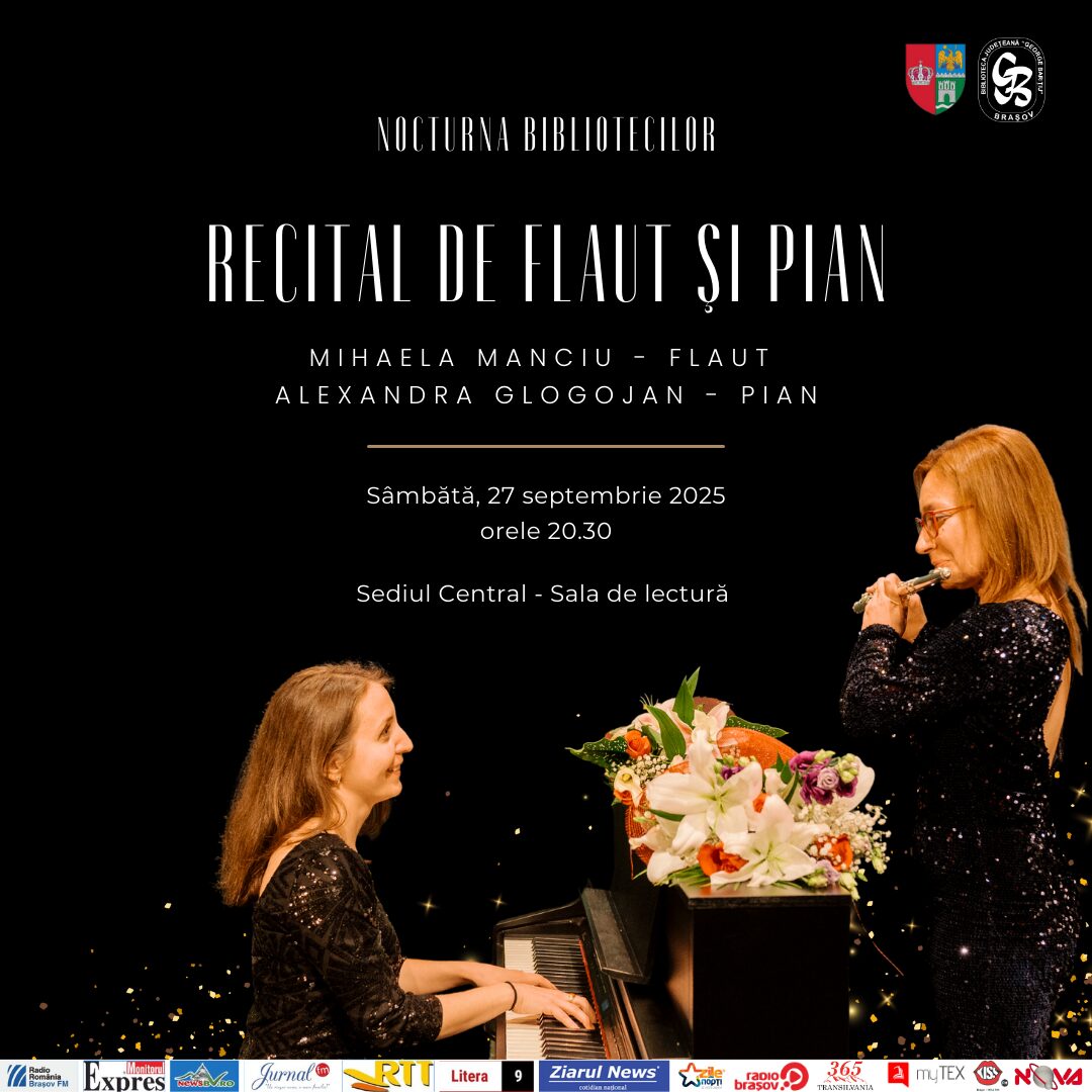 Începând cu ora 20:30, Sala de lectură devine scena unui recital extraordinar de flaut şi pian, susţinut de două muziciene de prestigiu: Mihaela Manciu (flaut) şi Alexandra Glogojan (pian). Distinse cu premii internaționale la categoria „profesioniști”, cele două îmbină cu succes activitatea concertistică și solistică cu cea pedagogică. Ele inspiră și formează noi generații de artiști la Liceul Vocațional de Muzică „Tudor Ciortea” din Brașov, unde elevii obțin, la rândul lor, premii la olimpiade și concursuri naționale și internaționale.
