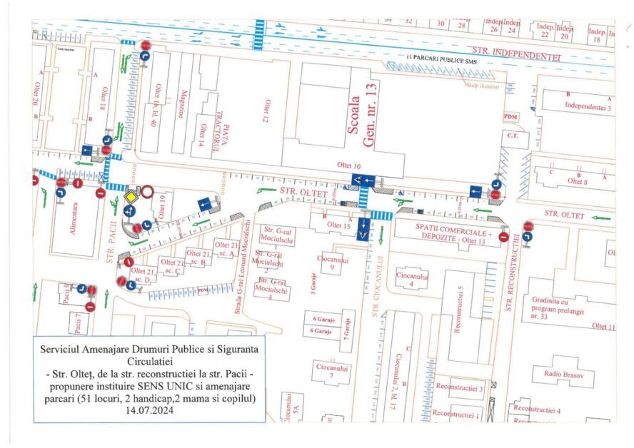 1. Instituire sens unic pe Str. Olteț pe direcția dinspre Str. Păcii spre Str. Valea Jiului și amenajare locuri de parcare;