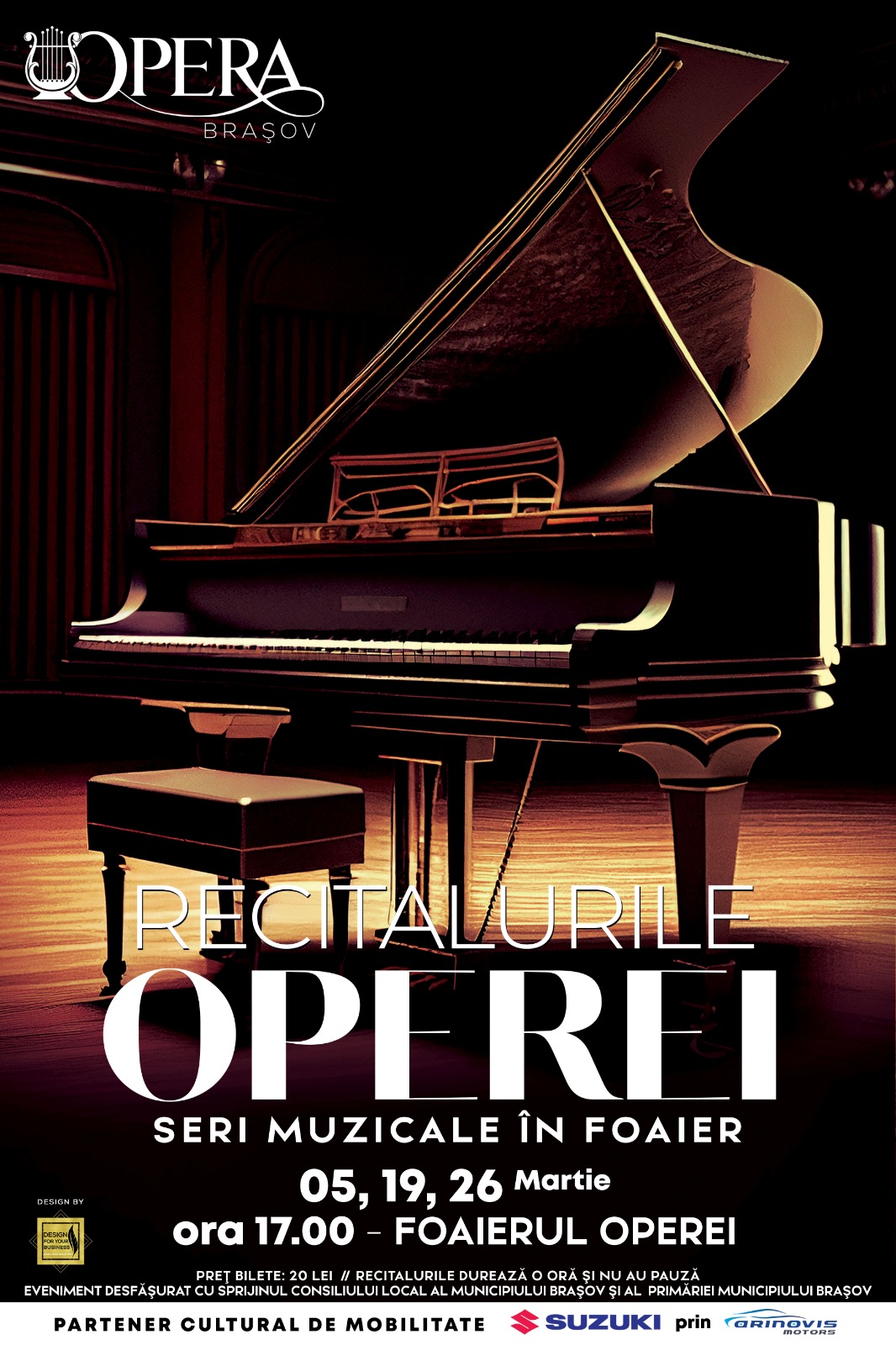 Joi, 5 martie 2026, de la ora 17.00, în Foaier, are loc o nouă ediție a Recitalurilor Operei Brașov – Seri muzicale în Foaier. Artiștii noștri vă vor oferi un program divers, menit să poarte melomanii prin cele mai frumoase pagini ale liricii universale și românești. Sunt cuprinse piese ca „De pe-o bună dimineață” – M. Barberis, arii și duete din „Silvia”, opereta lui Em. Kálmán, din „Don Pasquale”, opera lui G. Donizetti, dar și compoziții celebre: „La Spagnola” – V. Di Chiara, „Mattinata” – R. Leoncavallo, „Sole e Amore” – G. Puccini sau „La Serenata” – F. P. Tosti.
