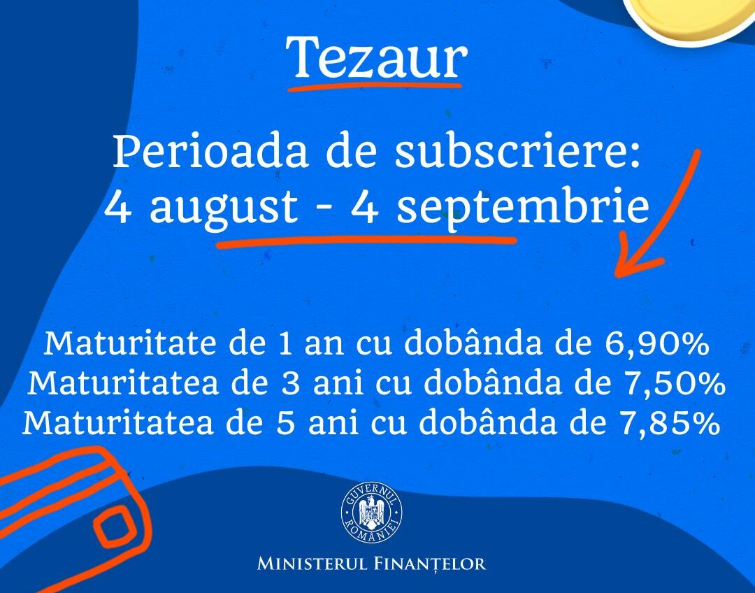 Astfel, în perioada 4 august – 5 septembrie 2025, românii pot investi în titlurile de stat TEZAUR, cu maturități de 1, 3 și 5 ani și dobânzi anuale de 6,90%, 7,50%, respectiv, 7,85%. Titlurile de stat au valoare nominală de 1 leu și sunt în forma dematerializată.