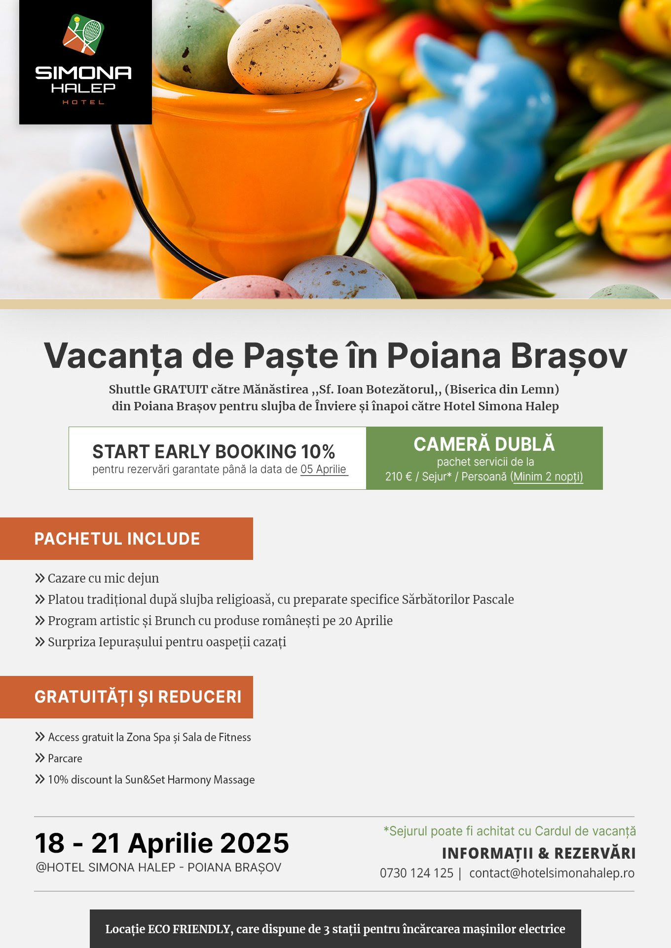 Cu ocazia sărbătorilor pascale, vă prezentăm o ofertă specială ULTRA LAST MINUTE pentru turiștii care își doresc un sejur elegant, relaxant și plin de savoare, într-un cadru montan spectaculos: Hotel Simona Halep – Poiana Brașov.