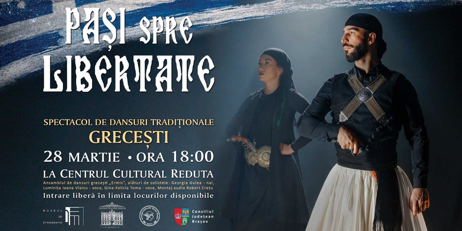 Asociația Culturală Ermis, în parteneriat cu Muzeul de Etnografie Brașov și Centrul Cultural Reduta, vă invită sâmbătă, 28 martie 2026, de la ora 18:00, la spectacolul de dansuri tradiționale grecești „Pași spre libertate”, un eveniment prilejuit de celebrarea Zilei Naționale a Greciei.