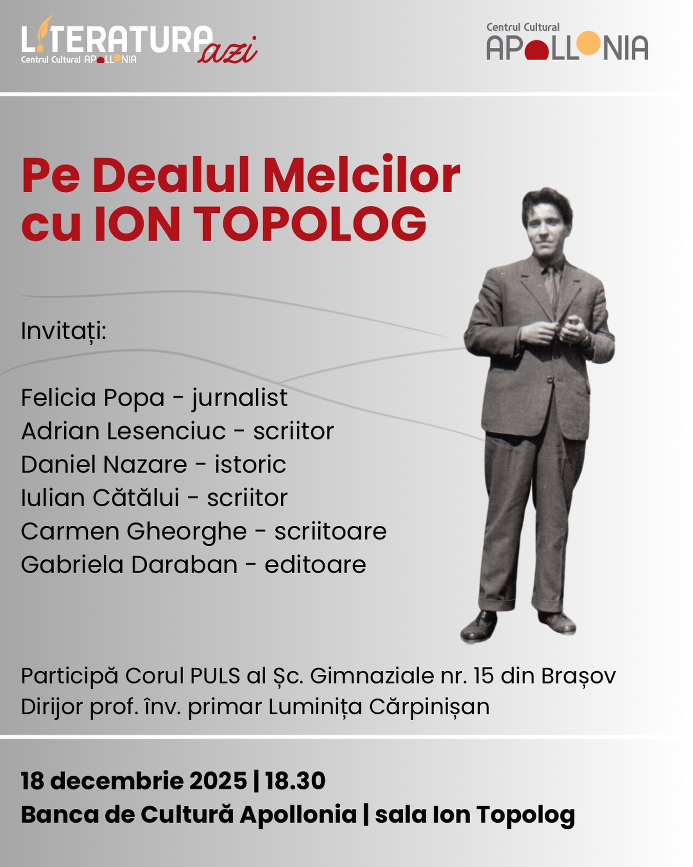 Ajuns la cea de-a III-a ediție, evenimentul „Pe Dealul Melcilor cu Ion Topolog” îi este dedicat, și în acest an, memoriei lui Ion Topolog – profesor, scriitor și editor, o personalitate profund legată de viața culturală a Brașovului, cunoscut pentru activitatea sa artistică și pentru implicarea constantă în slujba comunității. Evenimentul va avea loc miercuri, 18 decembrie, de la ora 18:30, în Sala „Ion Topolog” din cadrul Centrului Cultural Apollonia Brașov.