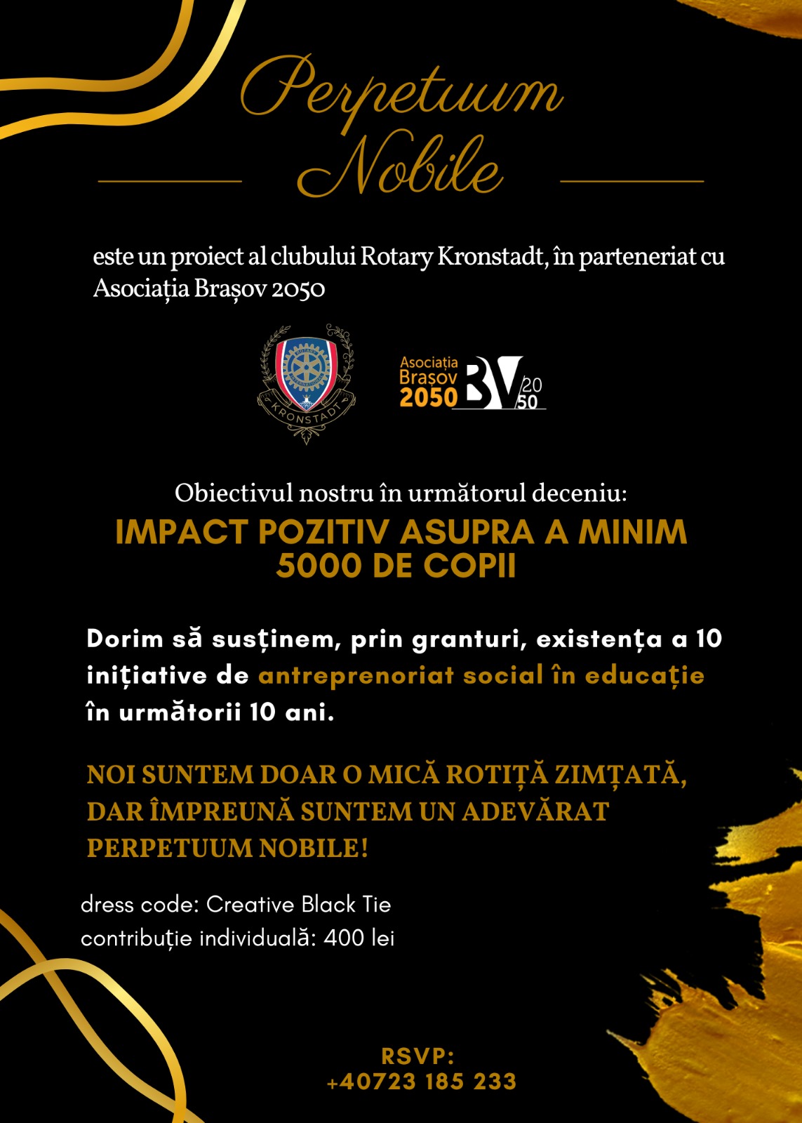 Clubul Rotary Kronstadt Brașov, în parteneriat cu Asociația Brașov 2050, lansează proiectul „Perpetuum Nobile”, o inițiativă pe termen lung dedicată susținerii educației copiilor din Brașov.