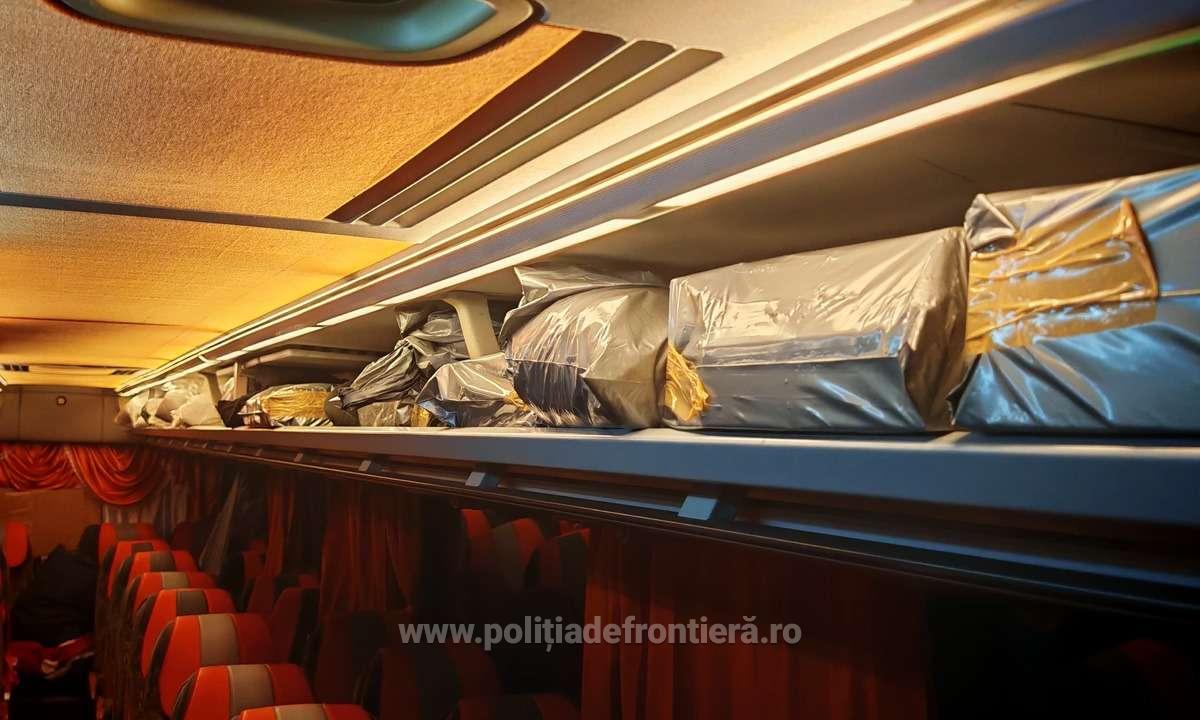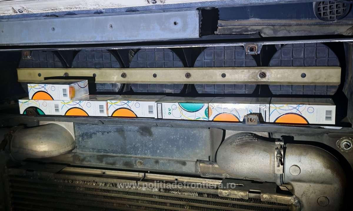 - 14.400 de țigarete (echivalentul a 720 de pachete), ascunse sub scaunul șoferului și în bordul autocarului, fără documente de proveniență;