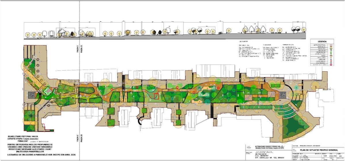 ,,Varianta pe care am găsit-o nu era în regulă, avea multe carențe, nu îndeplinea toate condițiile pentru ca proiectul să fie eligibil pentru o finanțare nerambursabilă, iar soluțiile nu erau cele mai bune, de exemplu era prevăzută o pardoseală de granit, care transforma pietonalul mai mult într-un mausoleu, decât într-o zonă de relaxare. Împreună cu echipa de la Urbanism am schimbat aceea pardoseală cu una naturală, drenată. Totodată, am ajuns, în varianta nouă, la aproape 6.000 de metri pătrați de zonă verde, la care se adaugă 68 de arbori, care vor fi plantați în cadrul acestui proiect. Astfel, brașovenii vor avea parte de un spațiu verde, cu mulți arbori plantați și o soluție total diferită, care este mult mai prietenoasă, mult mai bună și mult mai adaptabilă în momentul de față. Echipa de urbaniști și de proiectanți a venit cu o modificare substanțială în ceea ce înseamnă suprafața de zonă verde, numărul de arbori plantați pe pietonal. Practic, se creează o pădure urbană pe acest pietonal”, a explicat primarul George Scripcaru.