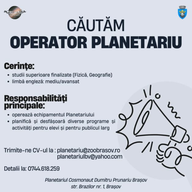 Dacă ești pasionat de astronomie și visezi la stele, acum ai ocazia să transformi pasiunea în profesie! Planetariul din Brașov angajează operator planetariu.