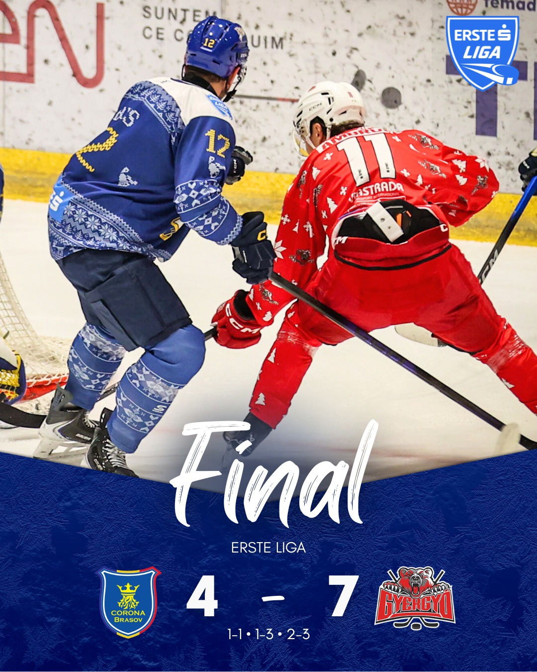 Corona Brașov a pierdut ieri seară în fața unei echipe decise să câștige și să aducă fanilor o victorie după câteva înfrângeri consecutive. Scorul a fost 4-7 pentru Gheorgheni, golurile Brașovului fiind marcate de Borysekno, Jeremy Welsh (două) și Zagidullin.