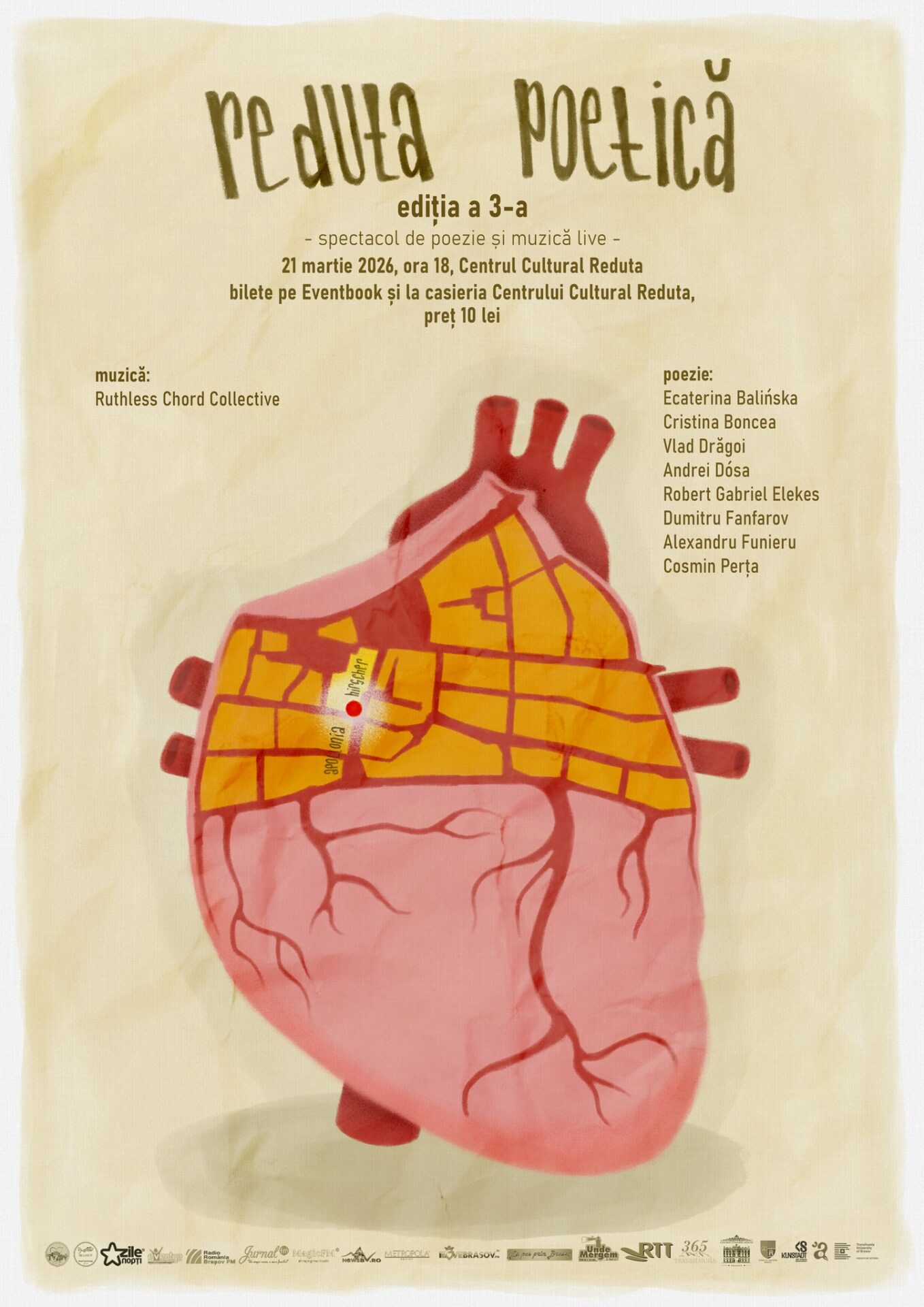 De Ziua Internațională a Poeziei, Centrul Cultural Reduta Brașov prezintă spectacolul de poezie și muzică live „Reduta Poetică”, ediția a III-a. Sâmbătă, 21 martie, începând cu ora 18.00, va fi celebrată poezia așa cum merită: live.