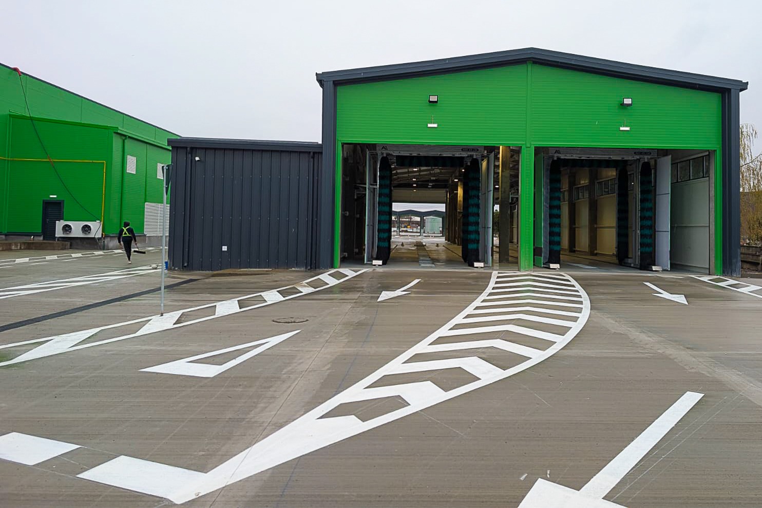 – Stație de spălare autobuze și rezervor îngropat de hidranți. Clădirea stației de spălare a autobuzelor este destinată realizării igienizării exterioare a autobuzelor, de fiecare dată când acestea se întorc din cursă. Instalația de spălare este automată și utilizează, în cadrul procesului de spălare, pentru partea de clătire, apa colectată din precipitații de pe suprafețele acoperișului halelor care formează ansamblul garajului. Sub camera tehnică a stației, prelungit și în exteriorul acesteia, va fi poziționat un rezervor rectangular de apă pentru hidranții interiori și exteriori, precum și o cameră de pompe cu acces direct din exterior. Suprafață: 838,92 m.p.