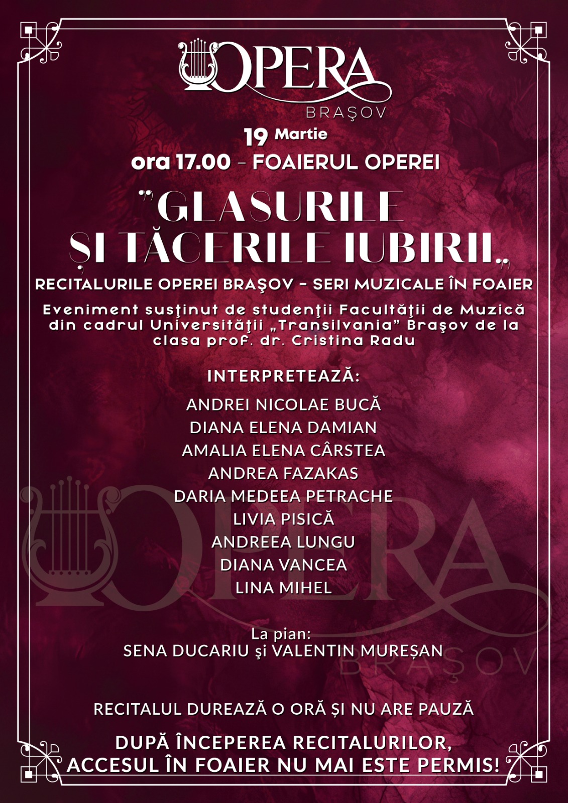 Joi, 19 martie 2026, de la ora 17.00, în Foaierul Operei, publicul este invitat la un nou eveniment muzical din seria „Recitalurile Operei Brașov – Seri muzicale în foaier”, intitulat „Glasurile și tăcerile iubirii”, fiind susținut de studenții Facultății de Muzică din cadrul Universității „Transilvania”, de la clasa prof. dr. Cristina Radu, solistă a Operei Brașov. Interpretează: Andrei Nicolae Bucă, Diana Elena Damian, Amalia Elena Cârstea, Andrea Fazakas, Daria Medeea Petrache, Livia Pisică, Andreea Lungu, Diana Vancea șiLina Mihel. La pian îi vor acompaniaSena Ducariu șiValentin Mureșan.