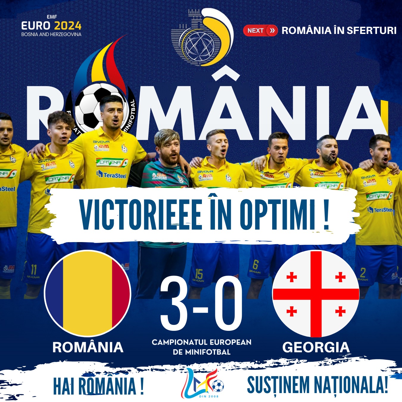 Naționala României de minifotbal a obținut o victorie convingătoare cu scorul de 3-0 împotriva Georgiei, asigurându-și locul în sferturile de finală ale Campionatului European de Minifotbal 2024. Meciul s-a desfășurat la Sarajevo, Bosnia și Herțegovina.