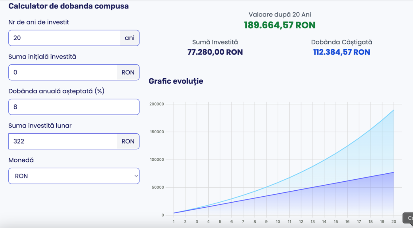 Prin investiții constante, chiar și a unei sume relativ mici de bani, se pot obține beneficii consistente. De exemplu, dacă timp de 20 de ani, am investi 322 de lei pe lună – echivalentul cheltuielilor medii pe alcool și tutun – într-un instrument financiar care generează un randament mediu de 8% pe an, am economisi 77.289 de lei. Dar la finalul perioadei, am avea în cont 189.664 de lei, bani care ar putea să ne ajute să rezolvăm o serie de probleme sau să atingem anumite obiective.