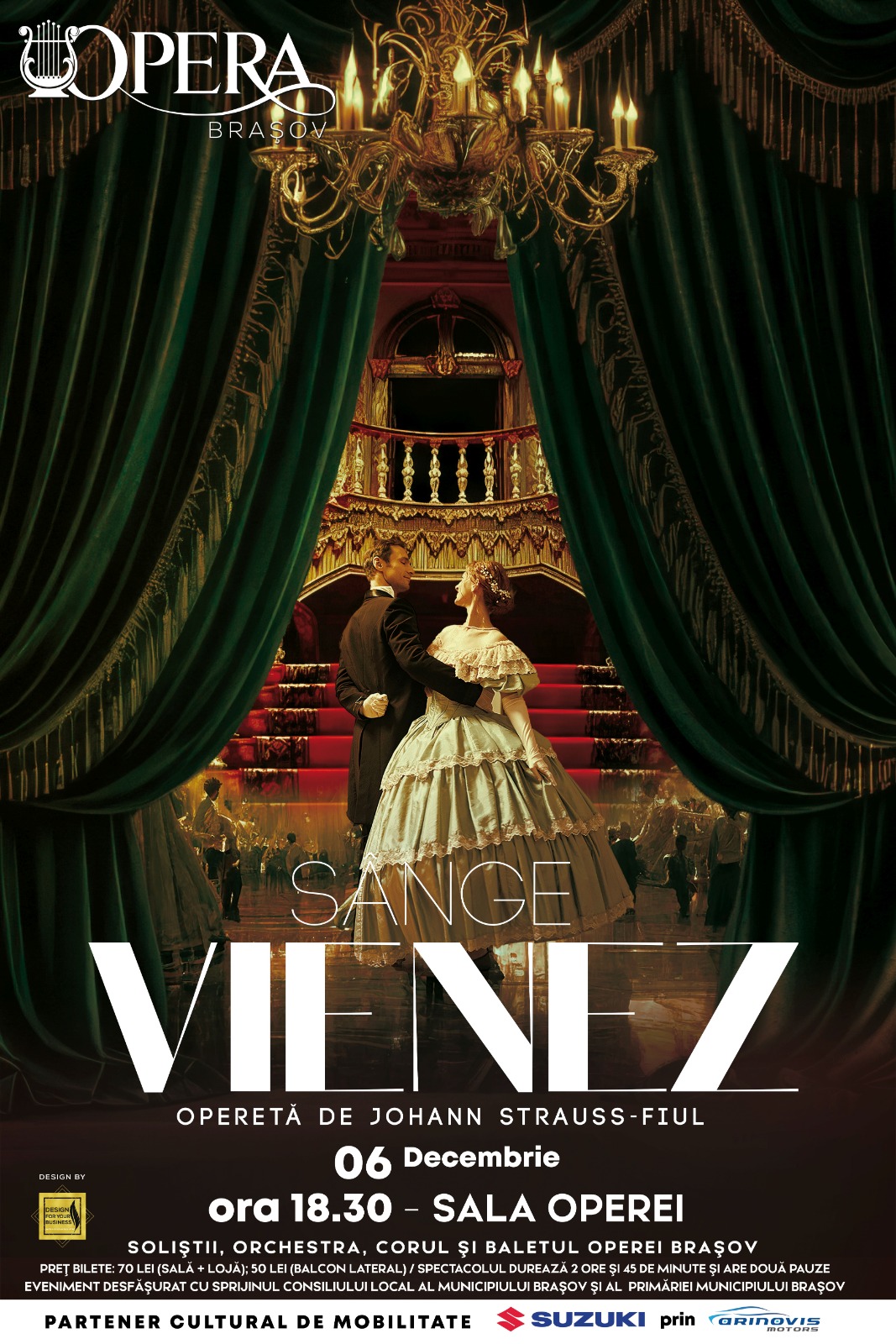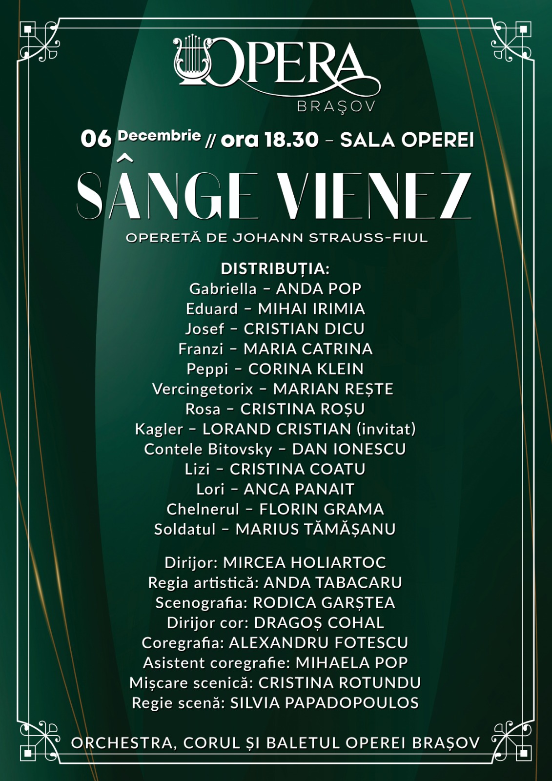 Sâmbătă, 6 decembrie 2025, de la orele 18.30, în Sala Operei, în anul sărbătoririi bicentenarului nașterii compozitorului Johann Strauss-fiul, publicul este invitat la spectacolul cu opereta „Sânge vienez”, una dintre cele mai populare lucrări ale genului.