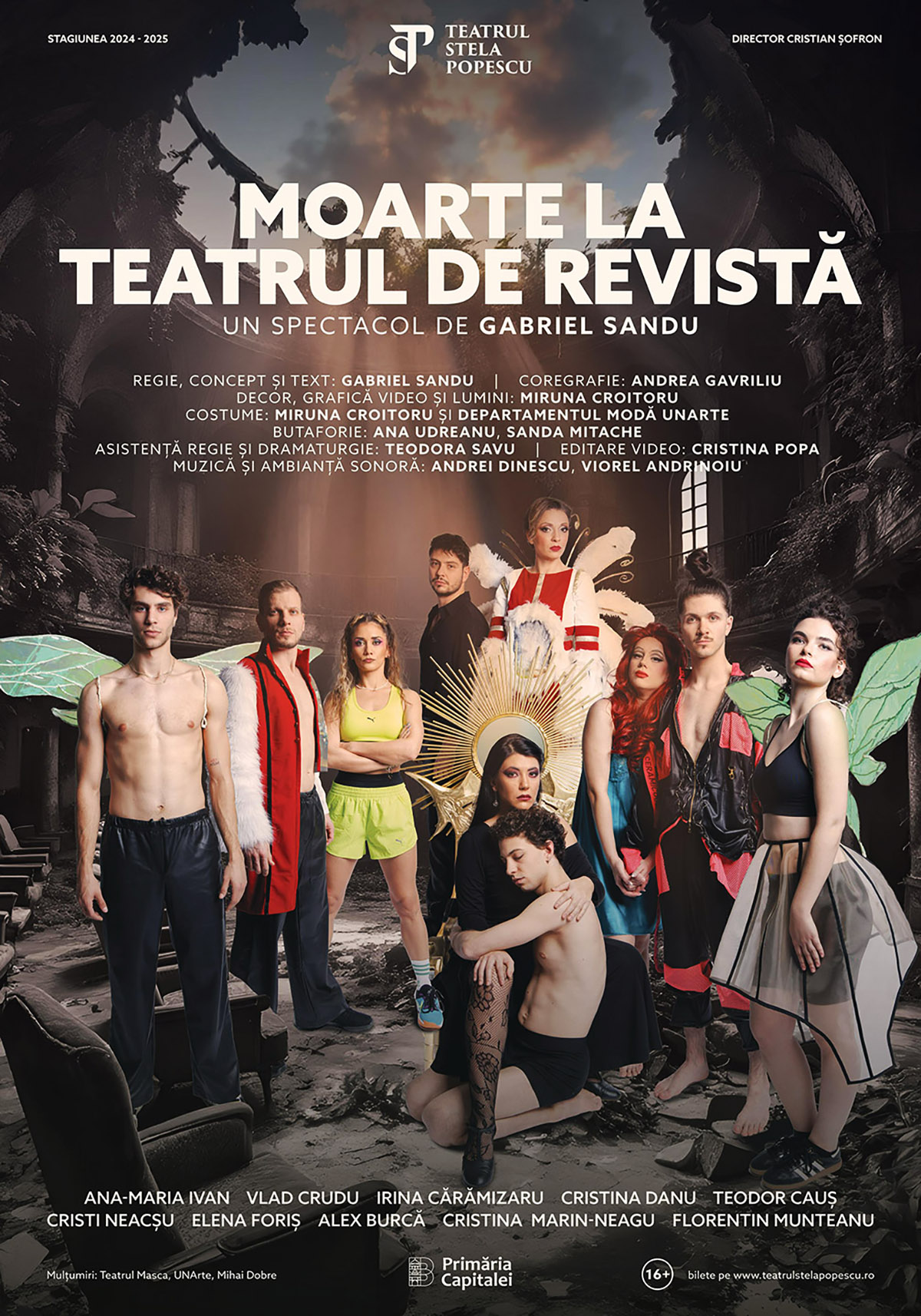 Teatru, muzică, dans, sânge și sclipici. Moarte la Teatrul de Revistă prezintă lupta unui mic teatru de varieté aflat pe marginea prăpastiei. Sub spectrul iminent al închiderii, directoarea teatrului face un gest disperat: aduce un regizor tânăr, cunoscut pentru viziunea sa modernă, să creeze un spectacol menit să readucă publicul în sală și să salveze instituția.