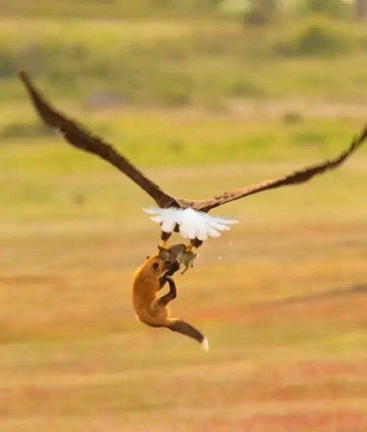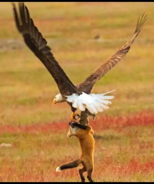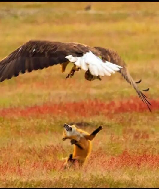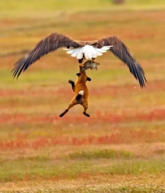 Totul a început atunci când vulpea, agilă și atentă, a reușit să captureze un iepure într-o poiană liniștită. Părea o victorie sigură, însă bucuria ei a durat doar câteva clipe. Din cer, planând în cercuri largi, un vultur a zărit scena și a coborât brusc cu o viteză uluitoare. În câteva secunde, prada s-a transformat din festinul vulpii într-o miză disputată.