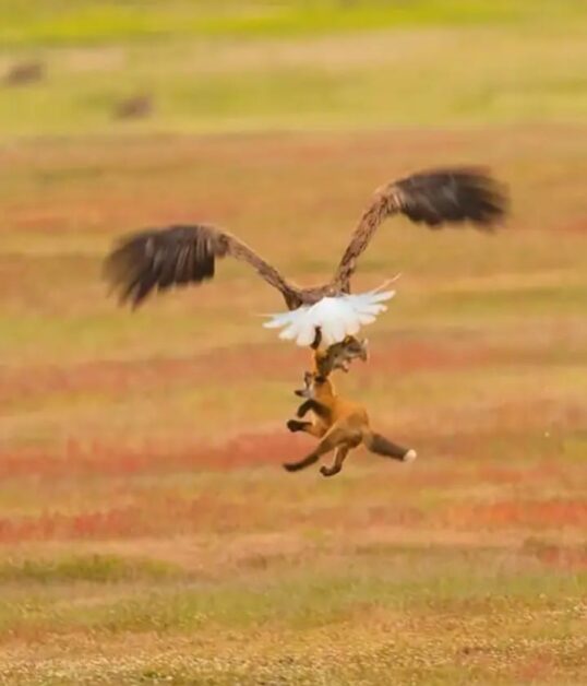 Seria de fotografii arată clar expresia de uimire și frustrare a vulpii, care a rămas fără pradă, în timp ce vulturul își ducea trofeul departe.