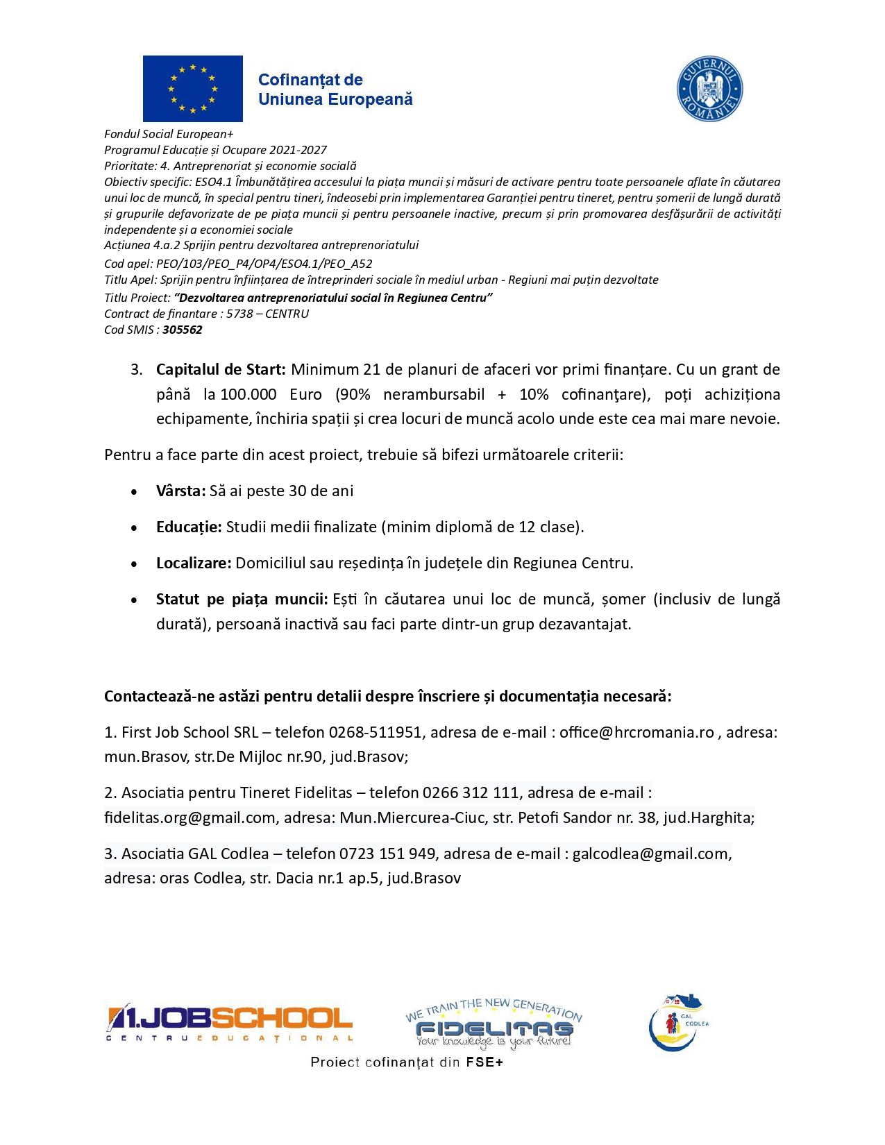 First Job School SRL, în parteneriat cu Asociația pentru Tineret Fidelitas și Asociația GAL Codlea, anunță lansarea proiectului „Dezvoltarea antreprenoriatului social în Regiunea Centru” (cod SMIS 305562).