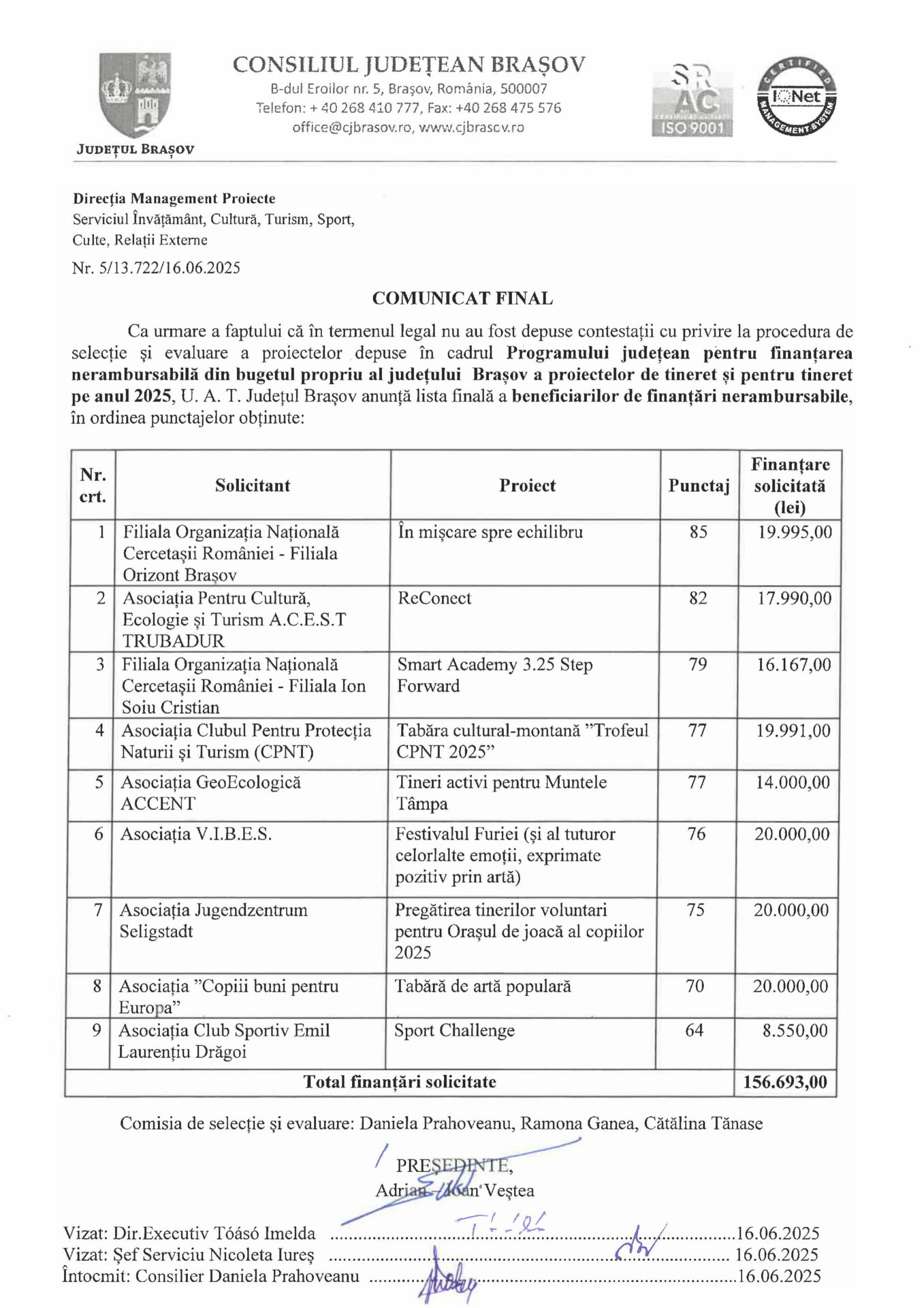 Consiliul Județean anunță lista finală a beneficiarilor de finanțări nerambursabile acordate din bugetul propriu al județului Brașov în cadrul Programului județean destinat susținerii proiectelor de tineret și pentru tineret pe anul 2025.
