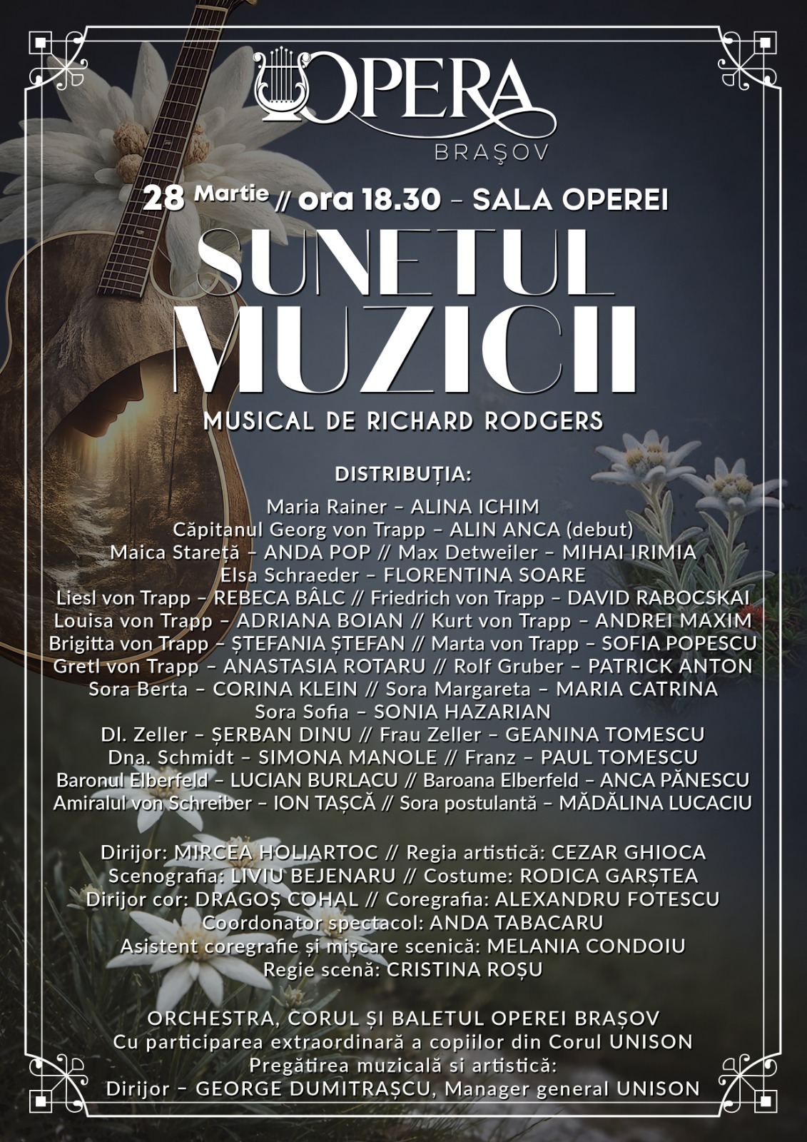 Musicalul semnat de Richard Rodgers, pe versurile lui Oscar Hammerstein II, aduce pe scenă povestea emoționantă a Mariei Rainer, inspirată din biografia Mariei Augusta von Trapp, o tânără care, prin muzică și optimism, reușește să transforme viața familiei von Trapp, într-un context marcat de evenimentele celui de-Al Doilea Război Mondial. Ajunsă guvernantă pentru cei șapte copii ai căpitanului, Maria schimbă atmosfera rigidă a casei într-una plină de căldură, bucurie și armonie, iar între ea și căpitan se naște o frumoasă poveste de dragoste. Însă liniștea familiei este zdruncinată de ascensiunea regimului nazist, iar în fața pericolului, aceștia aleg libertatea, într-o lecție despre curaj, solidaritate și puterea de a-ți urma visul.