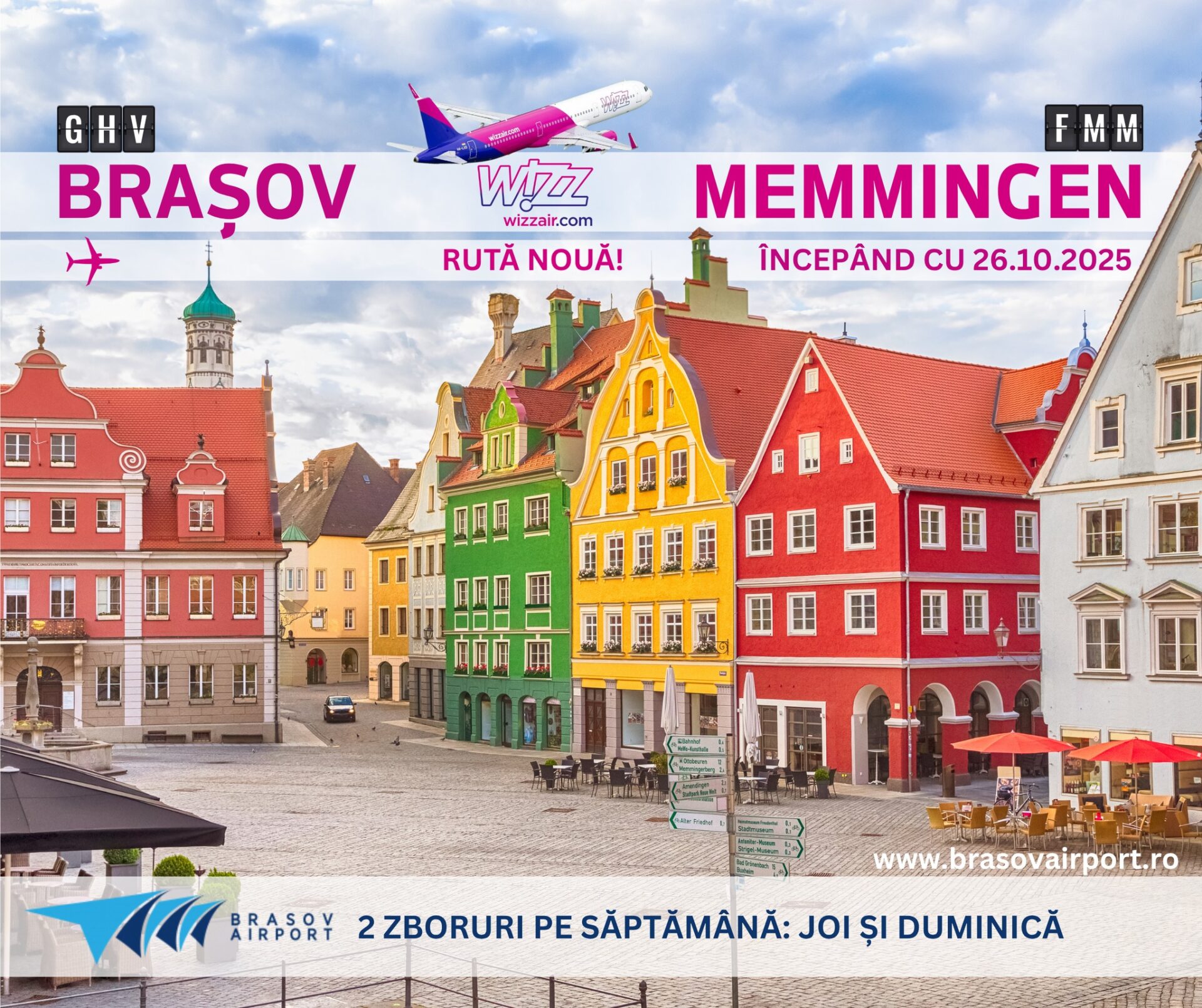 Vești excelente pentru pasagerii din Brașov! Compania aeriană Wizz Air a anunțat astăzi lansarea unei noi rute directe: Memmingen (FMM) – Brașov (GHV) – Memmingen (FMM). Această nouă conexiune aeriană va facilita călătoriile spre și dinspre Germania, oferind mai multe opțiuni pentru turism și afaceri. Începând cu 26 octombrie 2025, pasagerii vor beneficia de două […]