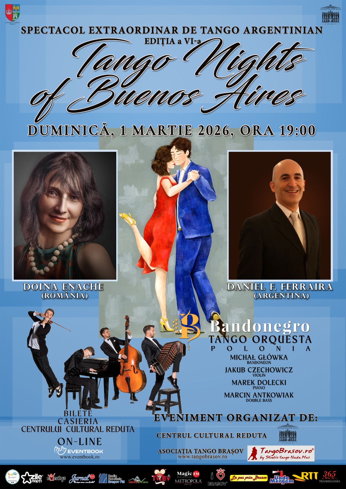 Centrul Cultural Reduta și Asociația Tango Brașov invită publicul brașovean duminică, 1 martie 2026, de la ora 20:00, la un concert-spectacol de excepție dedicat tangoului argentinian, în cadrul celei de-a VI-a ediții „TanGo Nights of Buenos Aires by Tango Brașov®”.