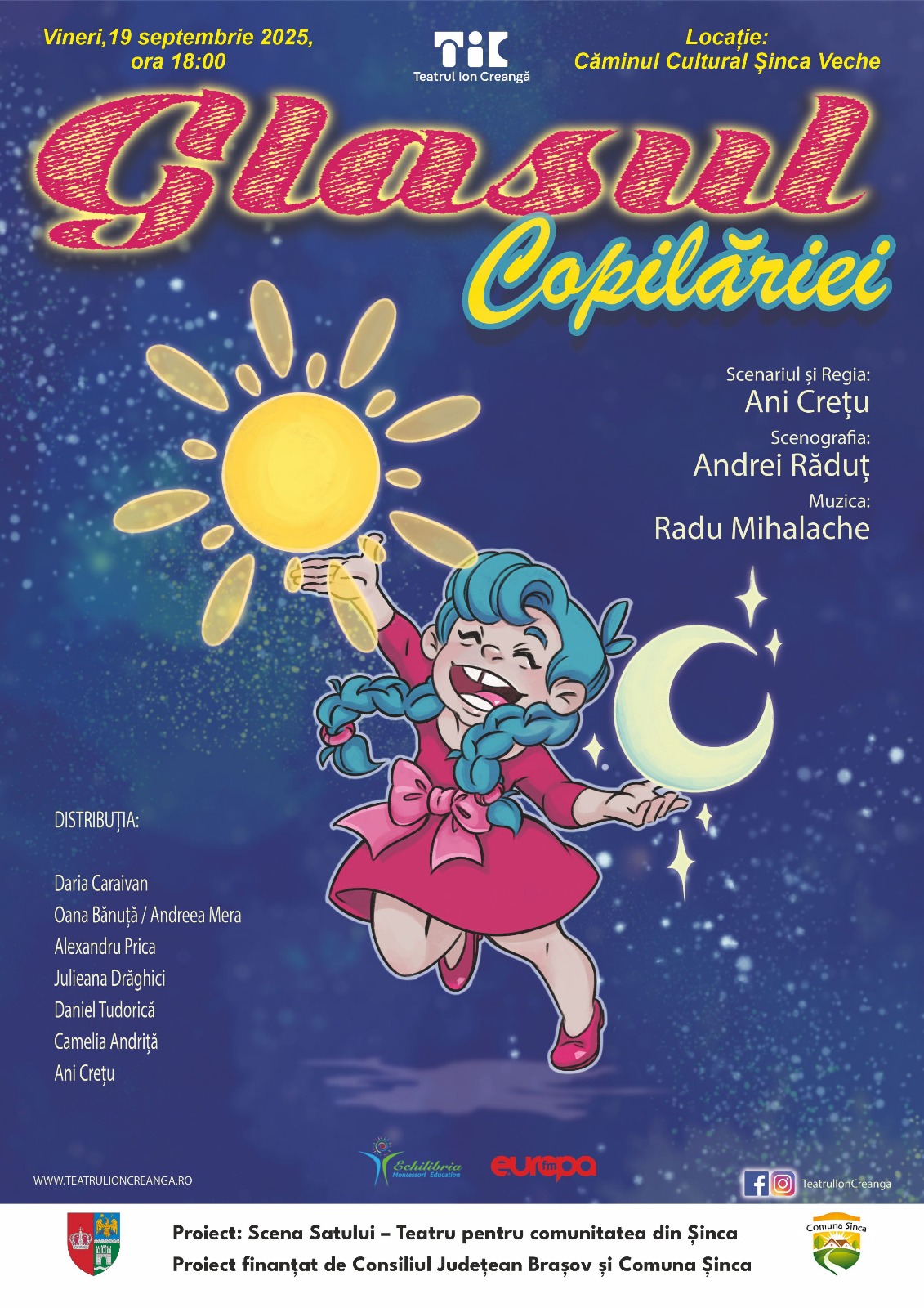 📆 Vineri, 19 septembrie, actorii Teatrului „Ion Creangă” din București susțin două reprezentații cu piesa „Glasul copilăriei” la căminele culturale din Șinca Nouă (ora 10:00), respectiv Șinca Veche (ora 18:00). Intrarea este liberă.