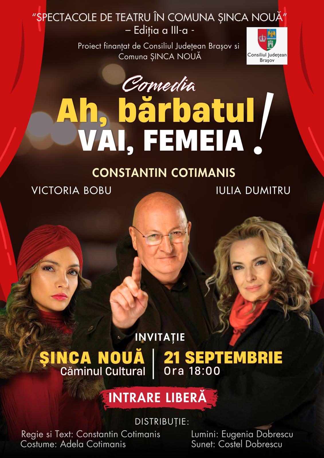 📆 Duminică, 21 septembrie, la Căminul Cultural din Șinca Nouă este rândul celor mari să se bucure de spectacolul de teatru „Ah, bărbatul – vai, femeia!”. Începând cu ora 18:00, cunoscuții și îndrăgiții actori Constantin Cotimanis, Iulia Dumitru și Victoria Bobu vă invită să-i urmăriți într-o comedie plină de personaje savuroase și dialoguri memorabile. Intrarea este liberă.