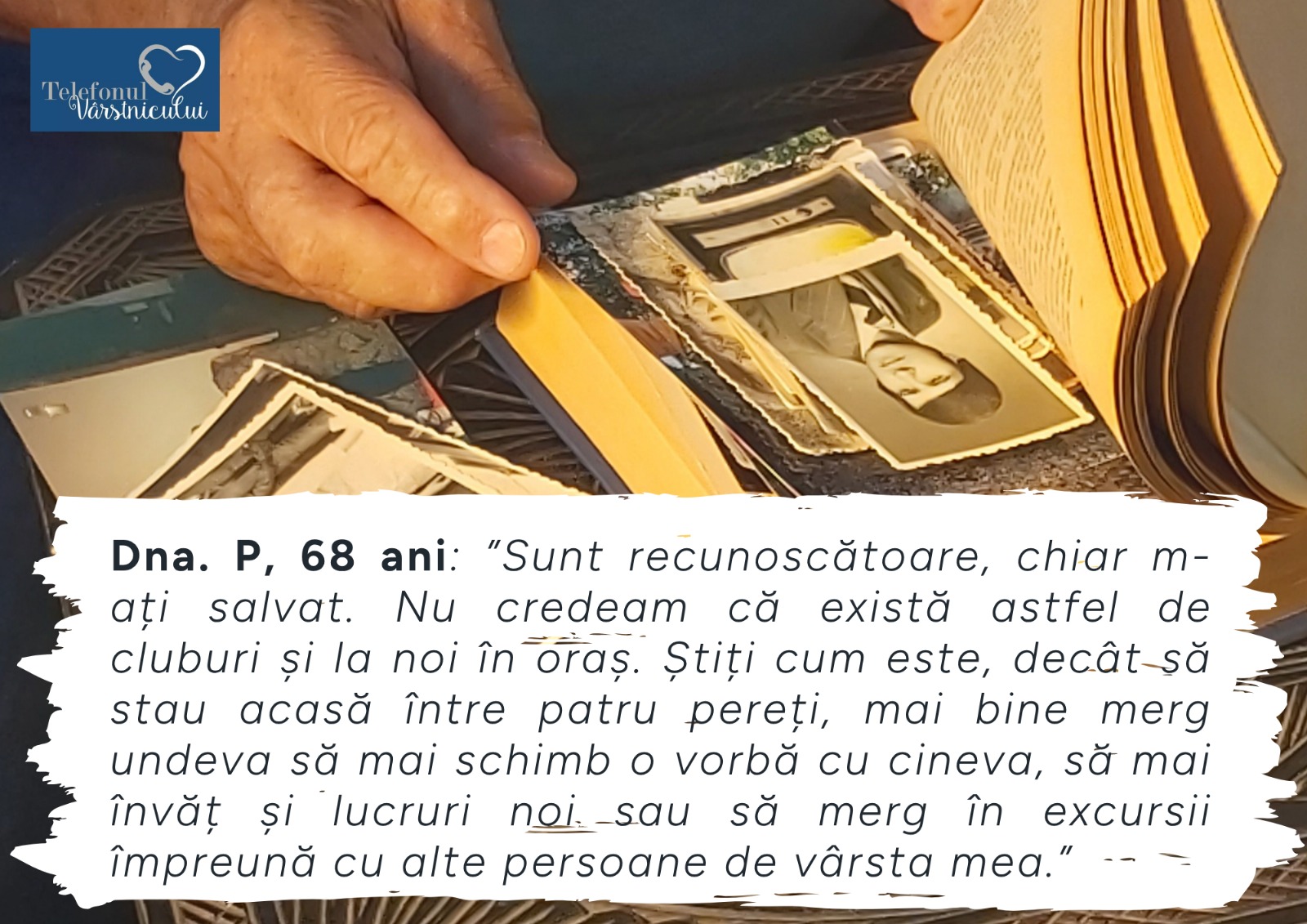 ”Sunt recunoscătoare, chiar m-ați salvat. Nu credeam că există astfel de cluburi și la noi în oraș. Știți cum este, decât să stau acasă între patru pereți, mai bine merg undeva să mai schimb o vorbă cu cineva, să mai învăț și lucruri noi sau să merg în excursii împreună cu alte persoane de vârsta mea.” – spune cu bucurie în voce doamna P, în vârstă de 68 ani, care a sunat din dorința de a ieși din casă și de a cunoaște oameni de aceeași vârstă cu a dumneaei