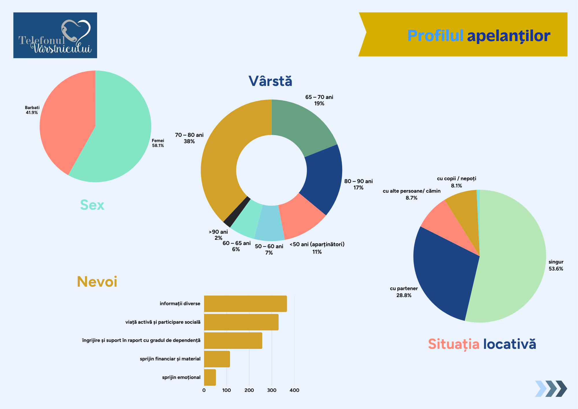 Femeile reprezintă 58% dintre apelanți, iar distribuția pe categorii de vârstă arată că cei mai mulți seniori apelanți sunt în intervalul 70-80 de ani (38%), urmați de cei între 65-70 de ani (19%) și cei între 80-90 de ani (17%). De asemenea, 11% dintre apeluri au venit din partea aparținătorilor, care au solicitat sprijin indirect pentru vârstnici.