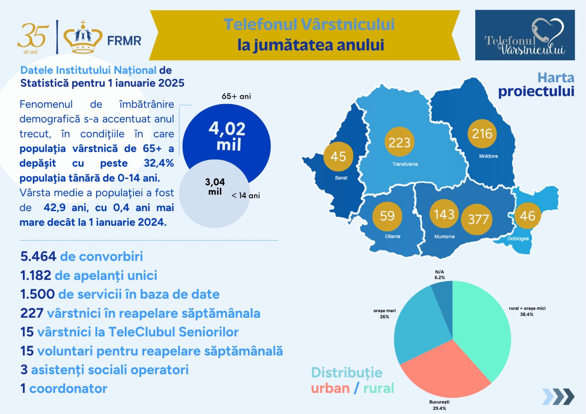 București, 10 iulie 2025 | În primele șase luni ale acestui an, linia socială gratuită Telefonul Vârstnicului – 0800 460 001, operată din anul 2015 de Fundația Regală Margareta a României, a înregistrat 5.464 de apeluri din întreaga țară. Dintre acestea, 1.182 de apelanți – seniori și aparținători – au sunat pentru prima dată, iar 54% dintre vârstnici au declarat că locuiesc singuri.