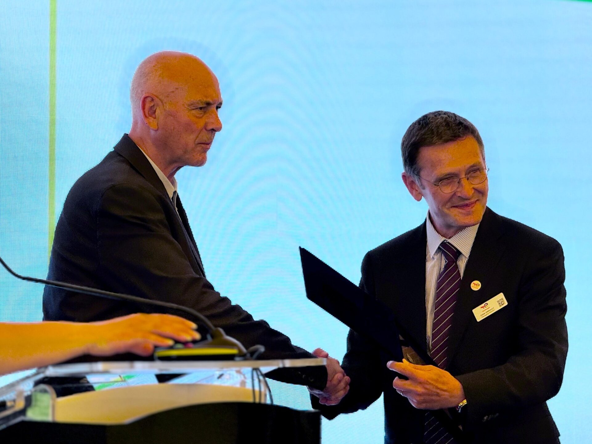 Oficialul a înmânat managerului companiei o plachetă aniversară din partea Consiliului Judeţean, „în semn de preţuire şi recunoaștere a performanţei în afaceri, precum şi a contribuţiei remarcabile aduse la dezvoltarea soluţiilor inovative din domeniu”.