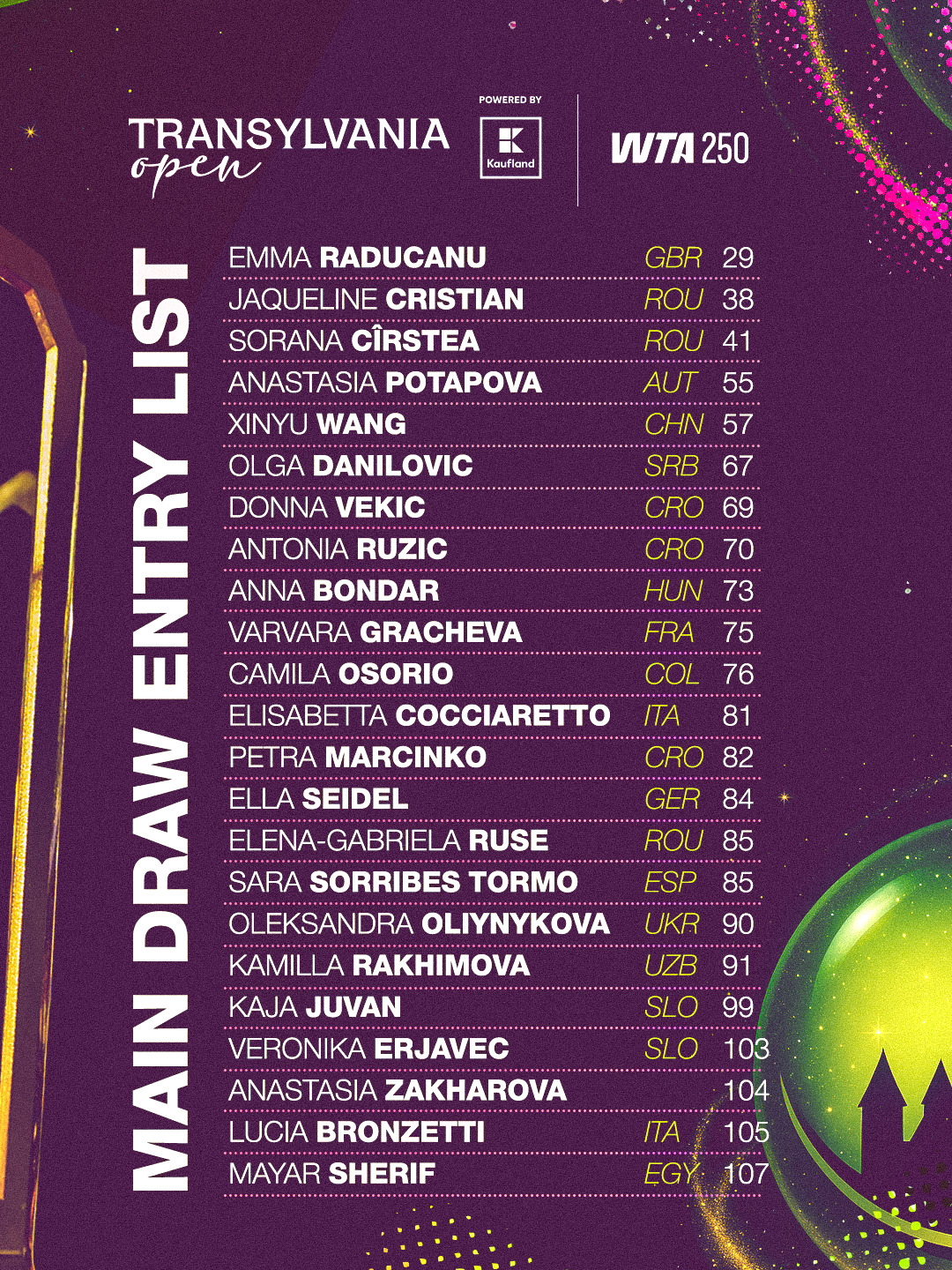 O prezență aparte va fi cea a Emmei Răducanu, campioană de Grand Slam, care va evolua pentru a doua oară la Transylvania Open. Cu origini românești, Emma se bucură de o susținere aparte din partea publicului din țară. Tabloul principal va include și alte jucătoare românce, precum Jaqueline Cristian, Ana Bogdan și Gabriela Ruse, toate aflate într-un parcurs ascendent. Jaqueline Cristian a încheiat anul trecut pe cel mai bun loc al carierei, 39 WTA, în timp ce Gabriela Ruse a revenit în top 100, pe locul 83, după ce a câștigat turneul de la Trnava.