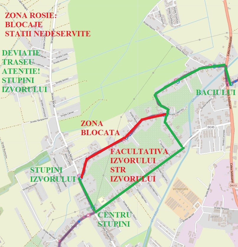 În aceste condiții, autobuzele de pe linia 24 vor circula din centrul cartierului Stupini pe străzile Fagurului, Fântânii, Calea Feldioarei și Baciului. Nu vor fi deservite perechile de stații: Facultativă Izvorului și Strada Izvorului.