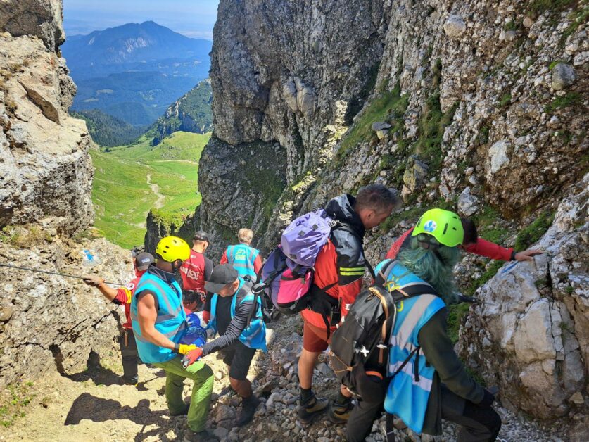 Acțiunea desfășurată în perioada 1-2 iulie pe cea mai tehnică parte a traseului de iarnă de la Cabana Mălăiești spre Vârful Omu a inclus instalarea a 200 de metri de lanț de susținere și consolidarea a 100 de