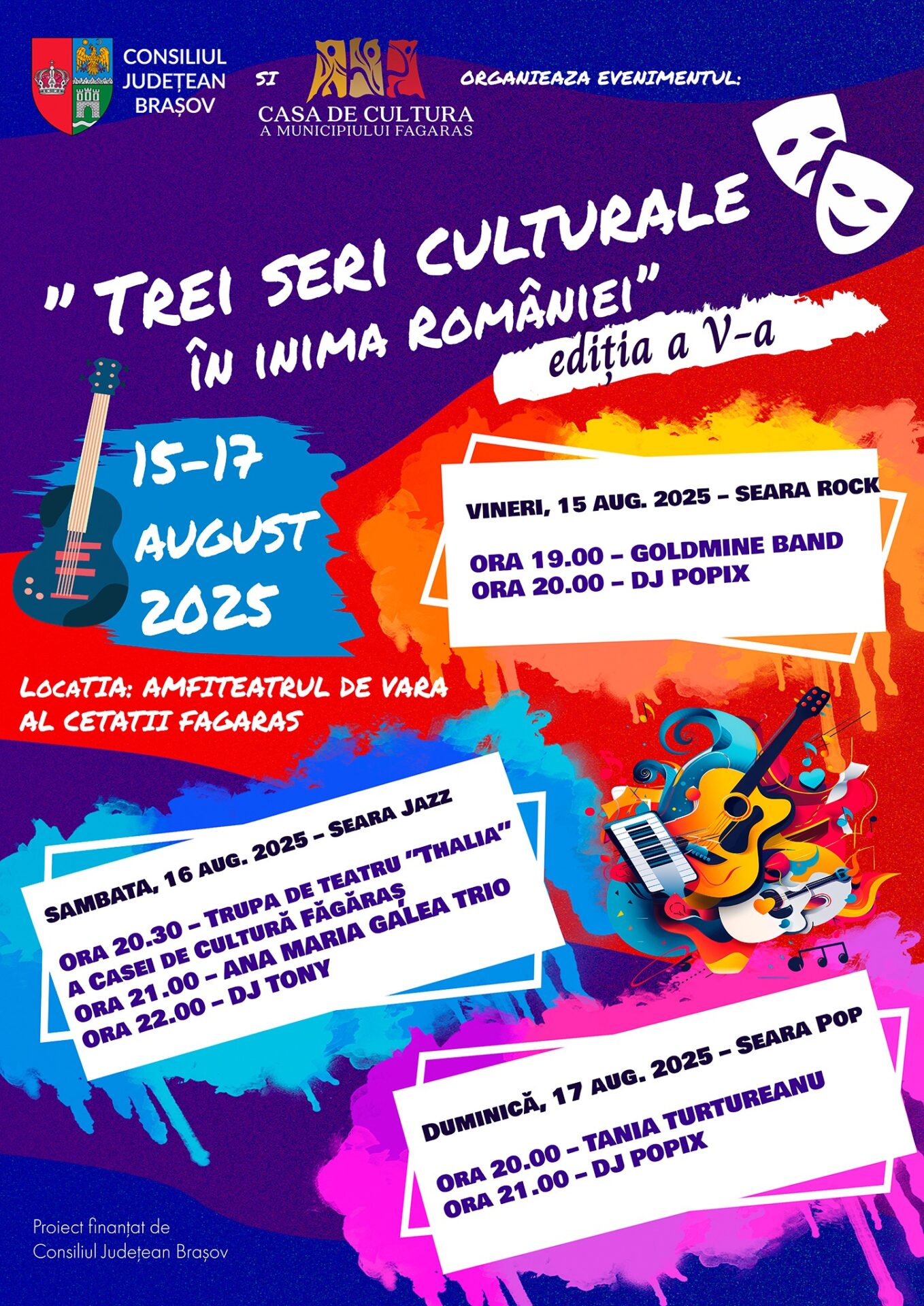 „Trei seri culturale în inima României” este un eveniment organizat de Casa de Cultură Făgăraș, cu sprijinul financiar al Consiliului Județean Brașov în cuantum de 30.000 de lei acordată în cadrul Program