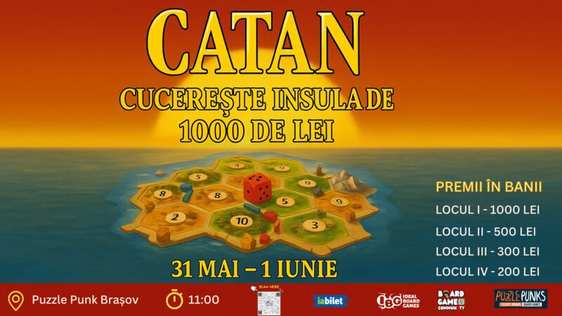 Pasionații de jocuri de societate sunt invitați la un eveniment special organizat de Board Games Community Sibiu în parteneriat cu Puzzle Punks Brașov: Turneul Catan al Verii – Insula de 1000 de Lei! Competiția va avea loc în inima Brașovului, la sediul Puzzle Punks, în perioada 31 mai – 1 iunie 2025.