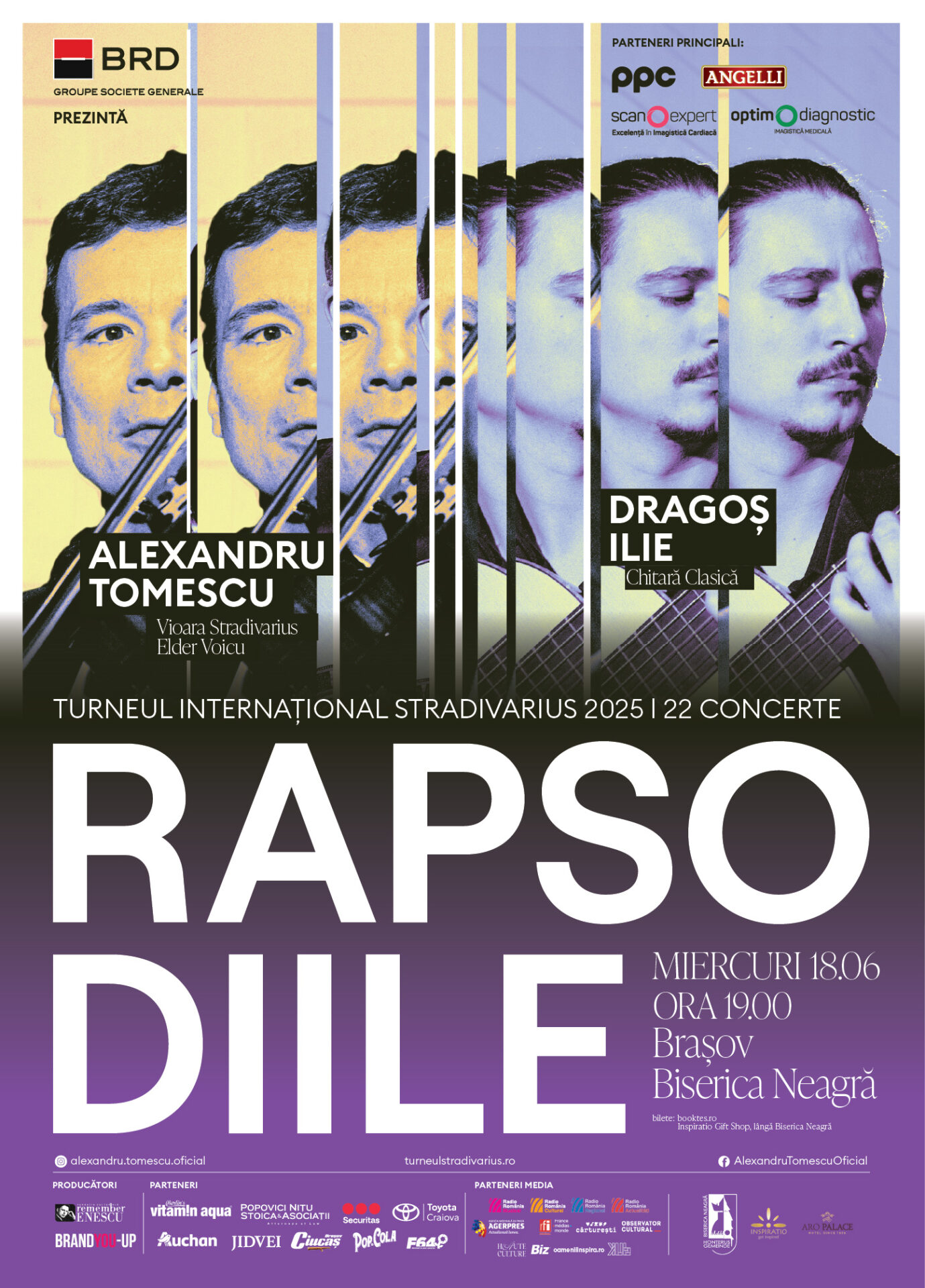 În data de 18 iunie, ora 19.00, Biserica Evanghelică C.A. din România – Parohia Brașov invită publicul la un concert extraordinar de vioară și chitară clasică, parte a Turneului Internațional Stradivarius, ajuns la cea de-a VIII-a ediție. Sub titlul sugestiv Rapsodiile, evenimentul aduce în prim-plan Muzică, Atitudine, Valori și, mai presus de toate, apropierea și deschiderea față de publicul tradițional, dar și față de noile generații de ascultători.