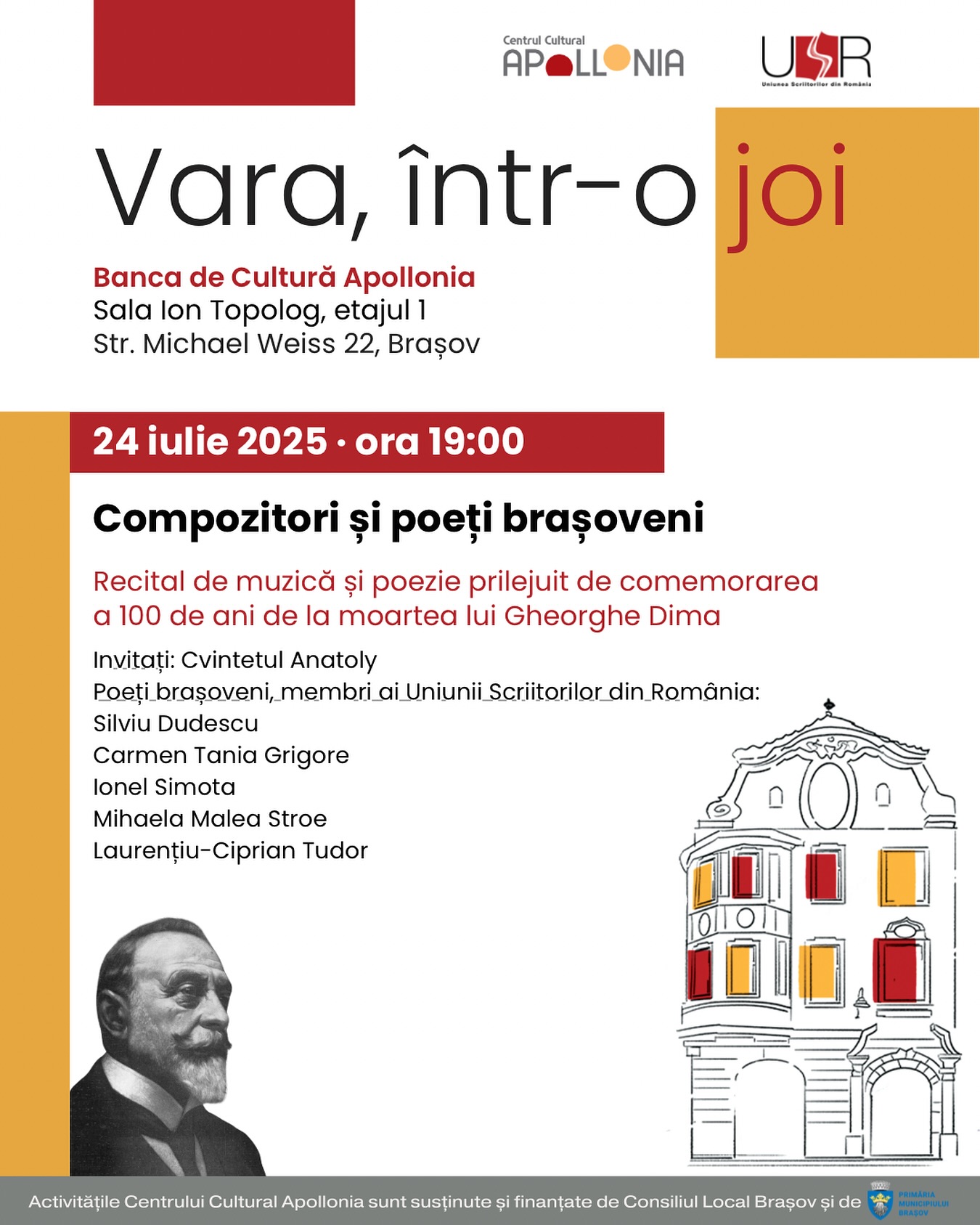 Cvintetul Anatoly și poeți brașoveni vă invită la o seară specială dedicată comemorării a 100 de ani de la moartea compozitorului, dirijorului și pedagogului Gheorghe Dima. Joi, 24 iulie 2025, de la ora 19:00, sunteti așteptati în sala Ion Topolog din incinta Băncii de Cultură Apollonia, în cadrul evenimentului „VARA, ÎNTR-O JOI”.