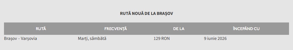 Ruta va fi operată în fiecare zi de marți și sâmbătă, începând cu 9 iunie 2026. Odată cu această extindere, Wizz Air ajunge la un total de 10 destinații diverse din cinci țări, operate de pe Aeroportul Internațional Brașov-Ghimbav. În plus, zborurile pe rutele deja anunțate către Roma Fiumicino și Katowice vor începe la începutul anului viitor, în 28 ianuarie, respectiv 31 martie. Noile rute adăugate în cursul ultimului an consolidează rețeaua deja extinsă a Wizz Air în România, întărind conectivitatea dintre regiunile-cheie ale țării și principalele centre economice din Europa.