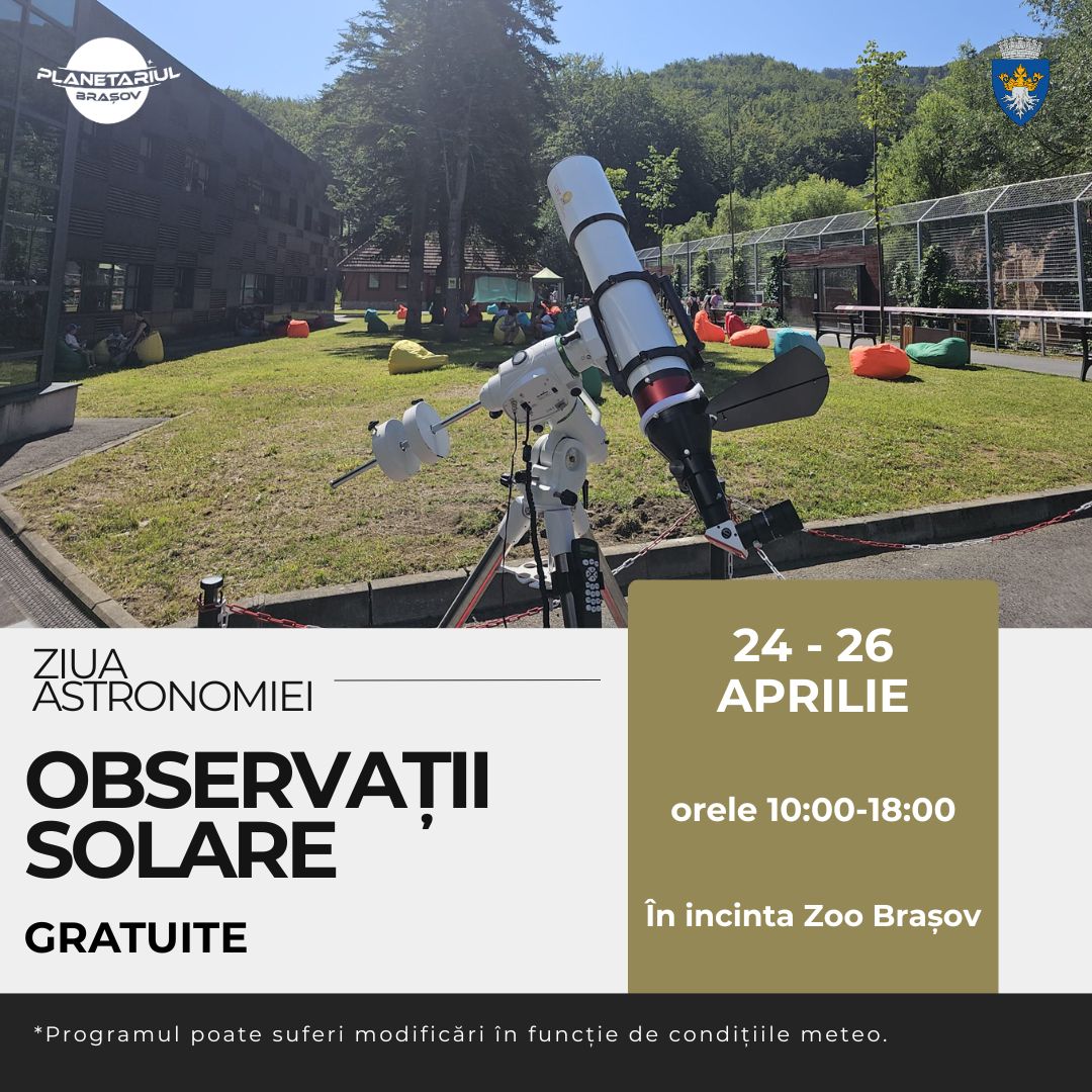 Acestea vor avea loc în incinta Grădinii Zoologice Brașov, unde vizitatorii vor putea descoperi detalii fascinante despre Soare, precum petele solare și activitatea acestuia, cu ajutorul echipamentelor specializate și sub îndrumarea personalului Planetariului.
