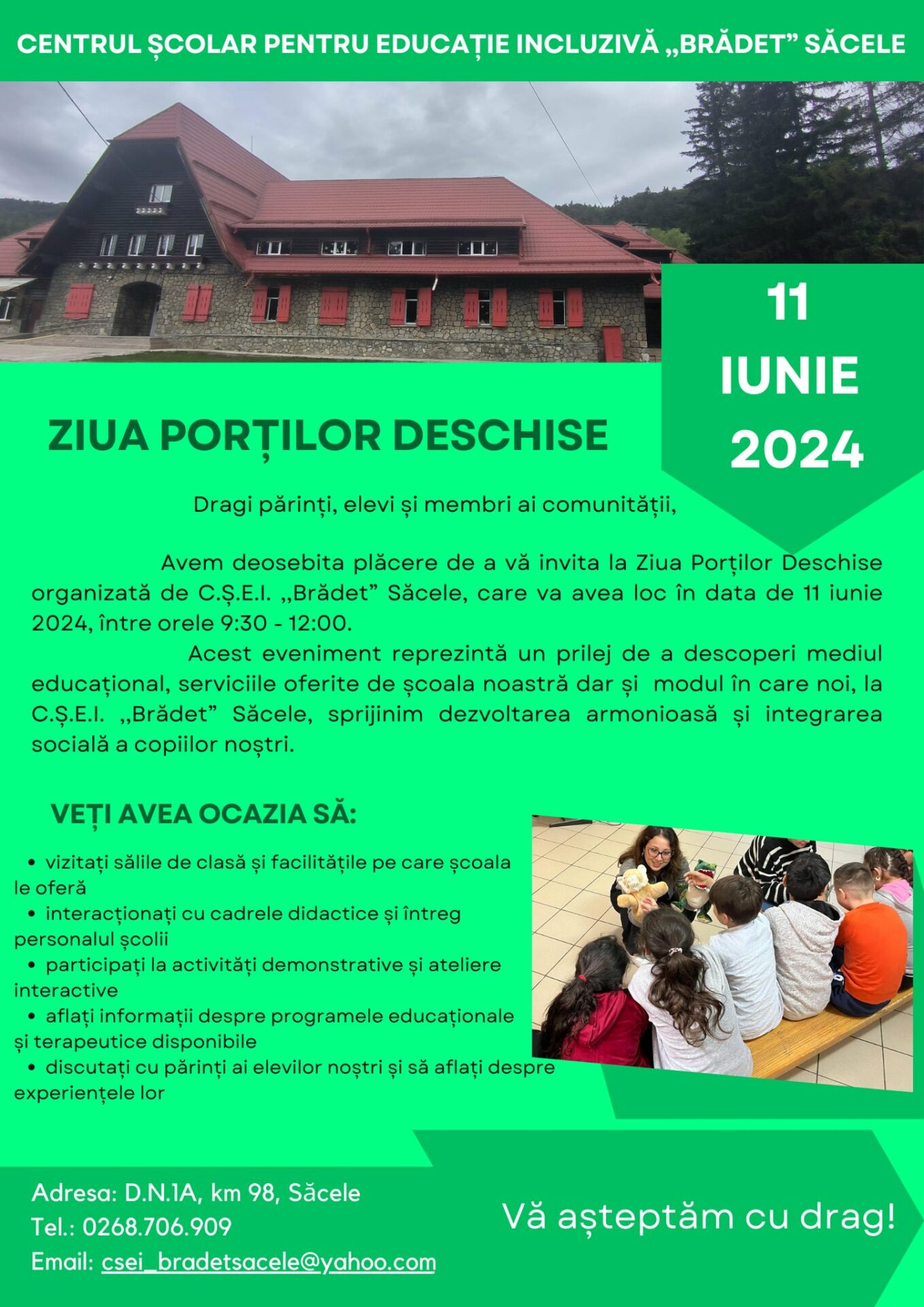 Centrul Şcolar pentru Educaţie Incluzivă „Brădet”, Săcele organizează Ziua Porţilor Deschise, în data de 11 iunie 2024.